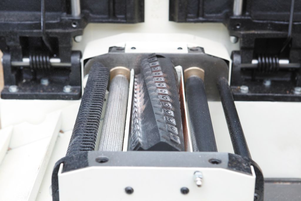 По основным характеристикам и удобству работы этот комбинированный станок не уступает отдельным рейсмусу и фуганку. Длинные и массивные чугунные столы создают базу, достаточную для работы с деталями длиной до 2-3 метров. Относительно специализированного станка несколько облегчен фуговальный упор: он не из чугуна, а из алюминиевого профиля. С другой стороны, эти модели обладают редким достоинством: удобную эксцентриковую регулировку по высоте имеет не только подающий, но и принимающий стол. Это необходимо, прежде всего, при замене строгального вала на helical, режущие пластины которого не регулируются по высоте.