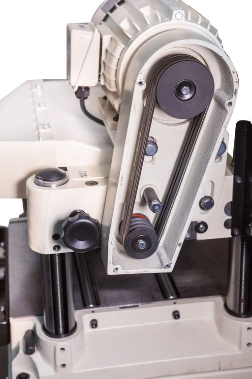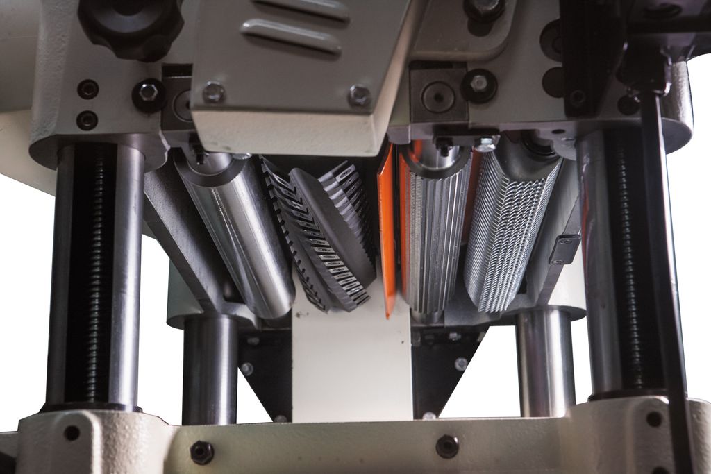 И рабочий стол, и корпус строгального узла выполнены из чугунных отливок, механизм регулировки высоты с четырьмя стальными колоннами – все это обеспечивает отличную жесткость и отсутствие вибраций. Используемый на рейсмусе механизм автоподачи имеет несколько особенностей: две скорости, для выбора режима строгания, два ролика в столе для облегчения скольжения и оба металлических, а не обрезиненных подающих вала.