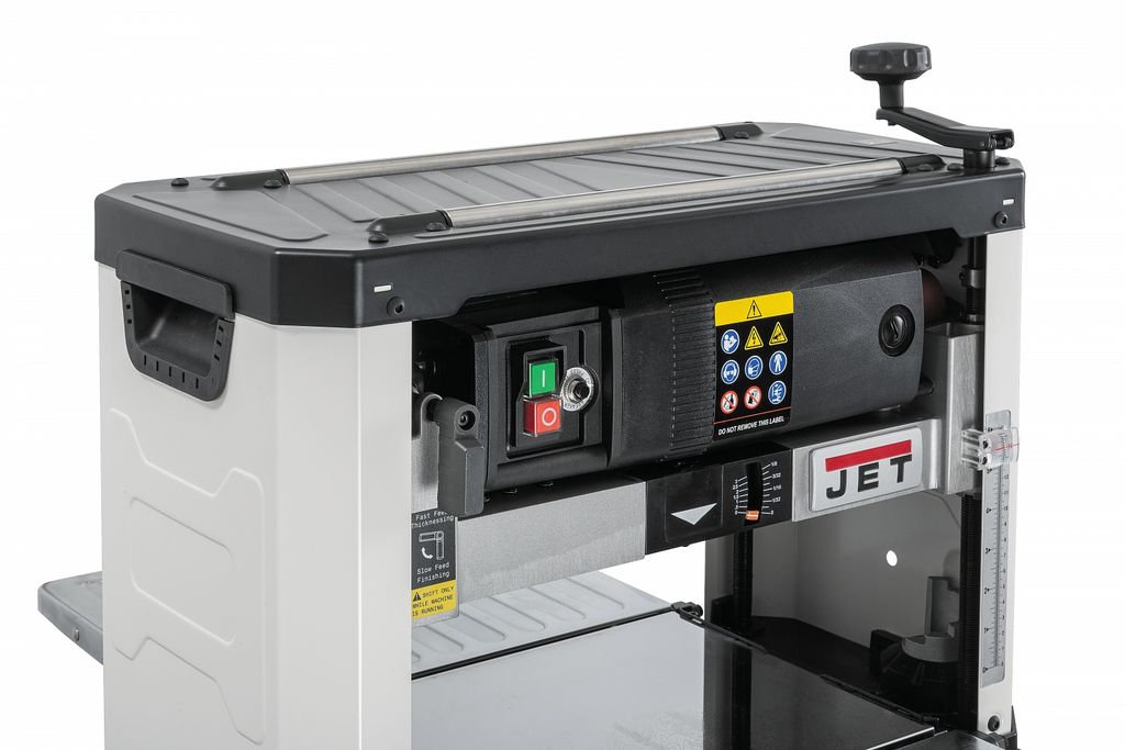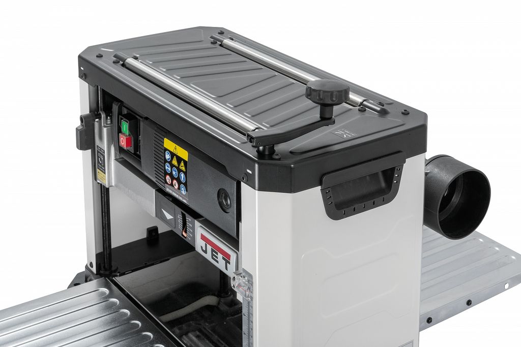 Станок оборудован двухскоростным механизмом подачи, валы имеют резиновое покрытие. Регулировка высоты строгания производится вращение рукоятки сверху, настройку облегчают измерительная миллиметровая шкала и револьверный упор с набором типовых значений толщин пиломатериалов. Предусмотрен измерительный индикатор с щупом для определения глубины съема древесины при строгании заготовки в установленный размер. Сверху корпуса ролики для обратной подачи заготовок.