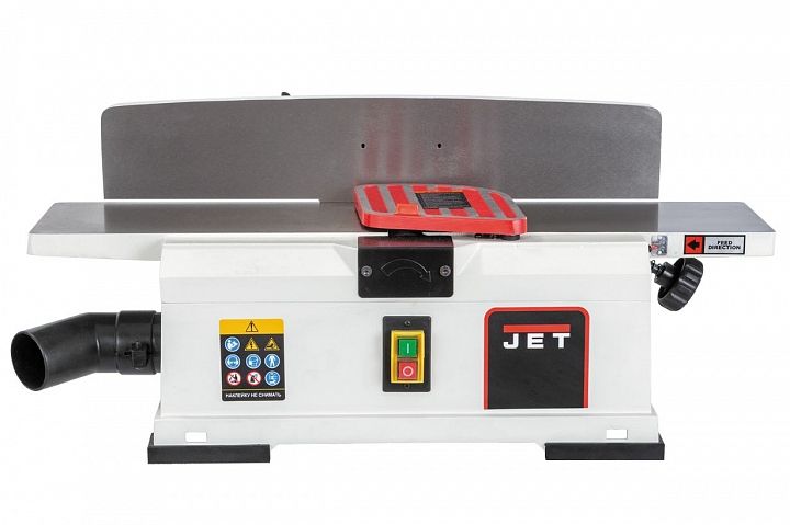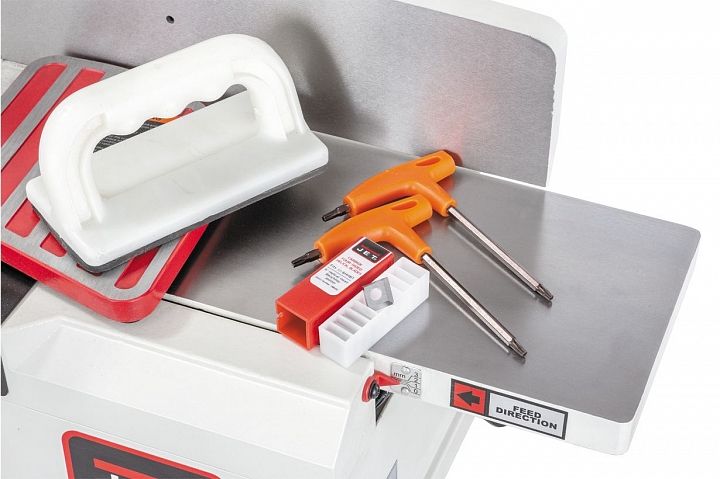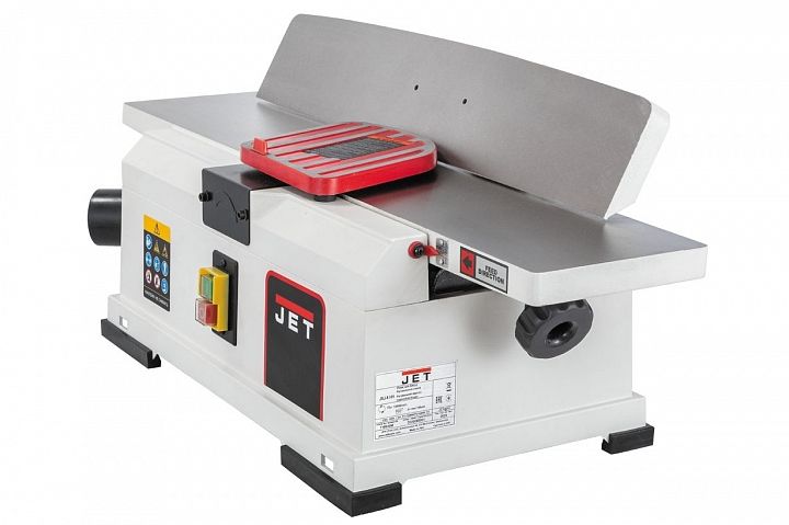 JSJ-6 HH — настольный фуганок с чугунными столами, мощным полуторакиловаттным коллекторным мотором и ножевым валом helical, наделяющим станок множеством достоинств и кардинально улучшающим его рабочие характеристики. На барабане установлено 14 лезвий, расположенных в виде двух спиралей так, чтобы усилие при снятии стружки возникало равномерно по всему обороту. В результате вибрации шум значительно ниже, чем у строгальных с прямыми длинными ножами.