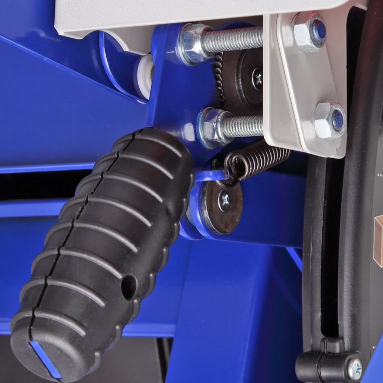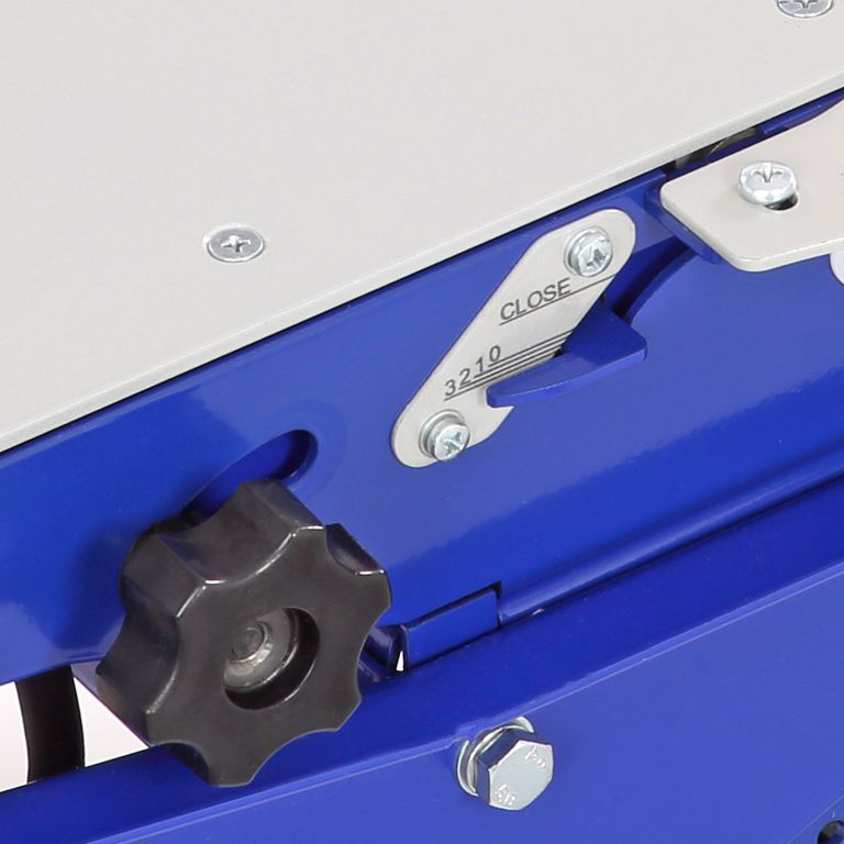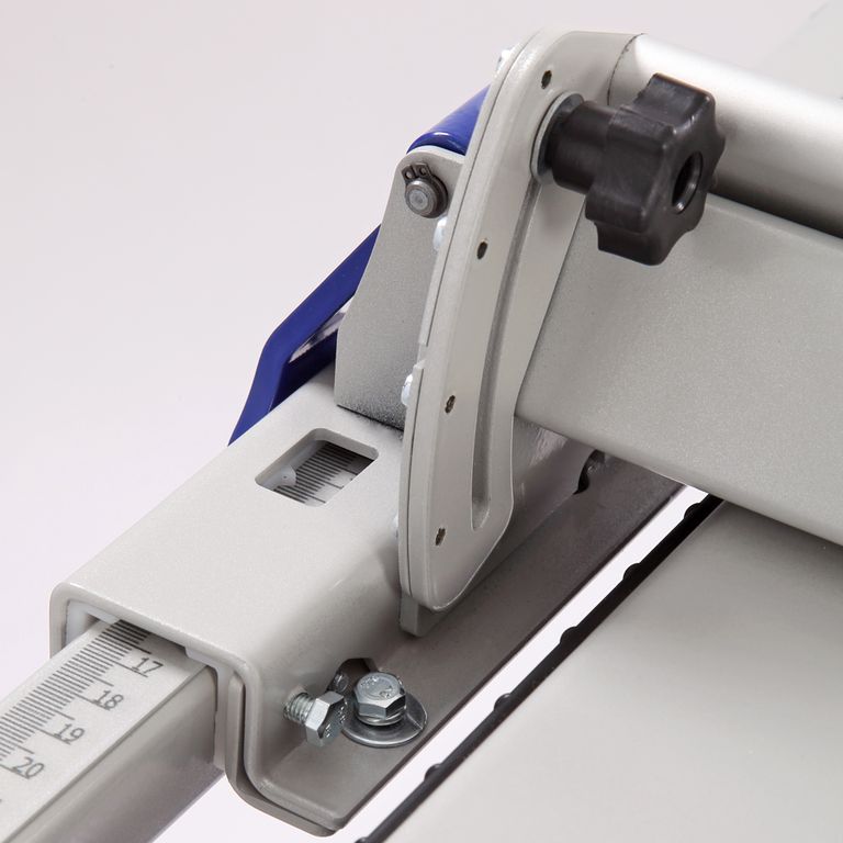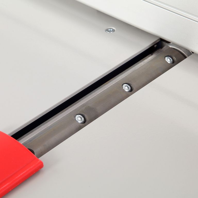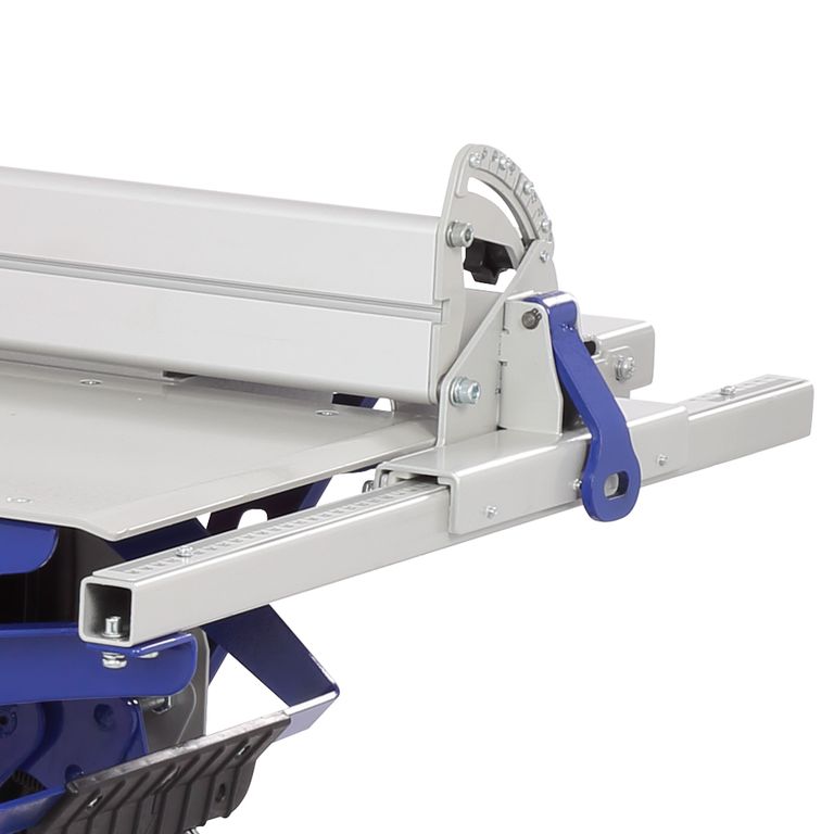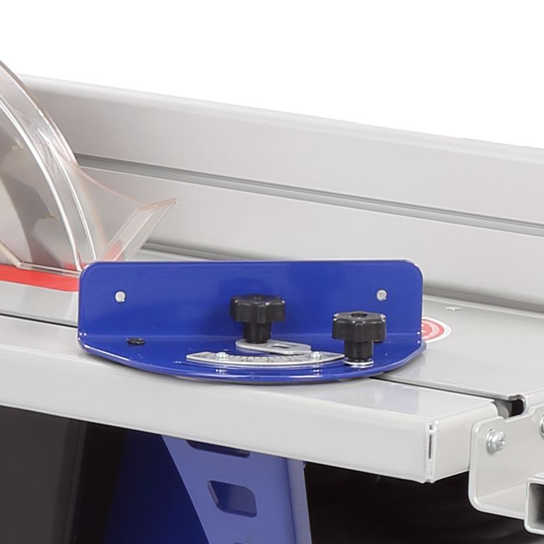 Станок оснащен параллельным упором, который устанавливается на направляющие со шкалами. Его можно использовать как при пилении (с обоих сторон режущего инструмента), так и при строгании. Установка проста: на одной стороне упора находится зацеп, на второй – фиксатор. Направляющая упора выполнена из алюминиевого профиля. Ее можно установить под углом от 0 до 45°.