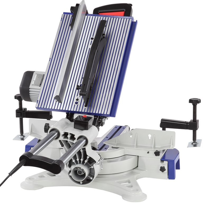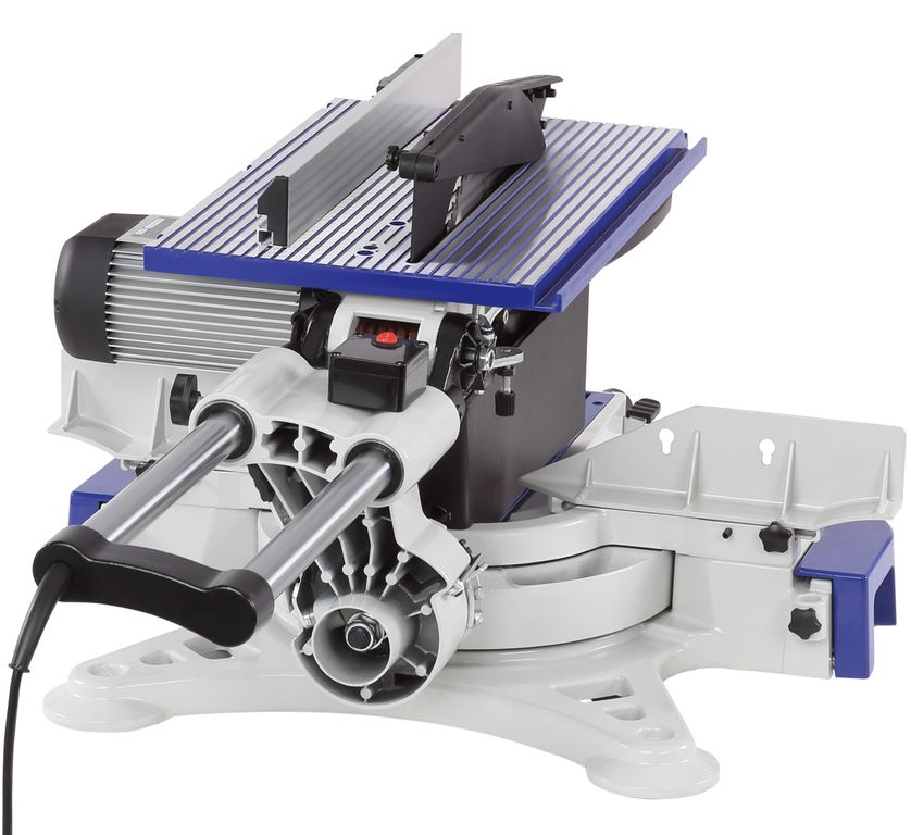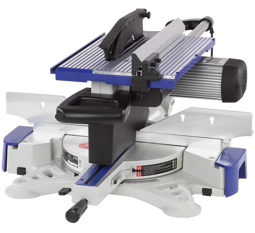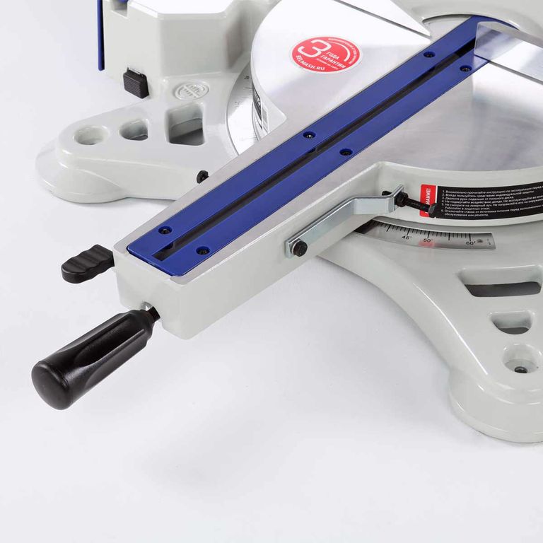 Пила оснащена поворотным основным столом (-50...+60 градусов), его диаметр 336 мм. По бокам имеется два расширения. В раздвинутом состоянии максимальная ширина составляет 1060 мм, минимальная – 660 мм. Стол оснащен упором с двумя регулируемыми вставками и местом для установки двух струбцинов для надежной фиксации детали.