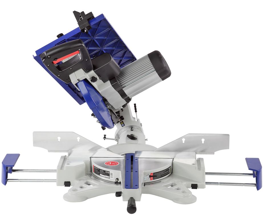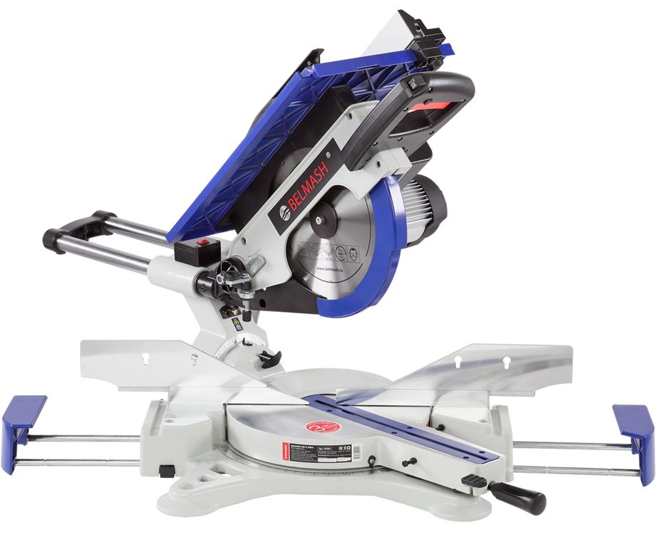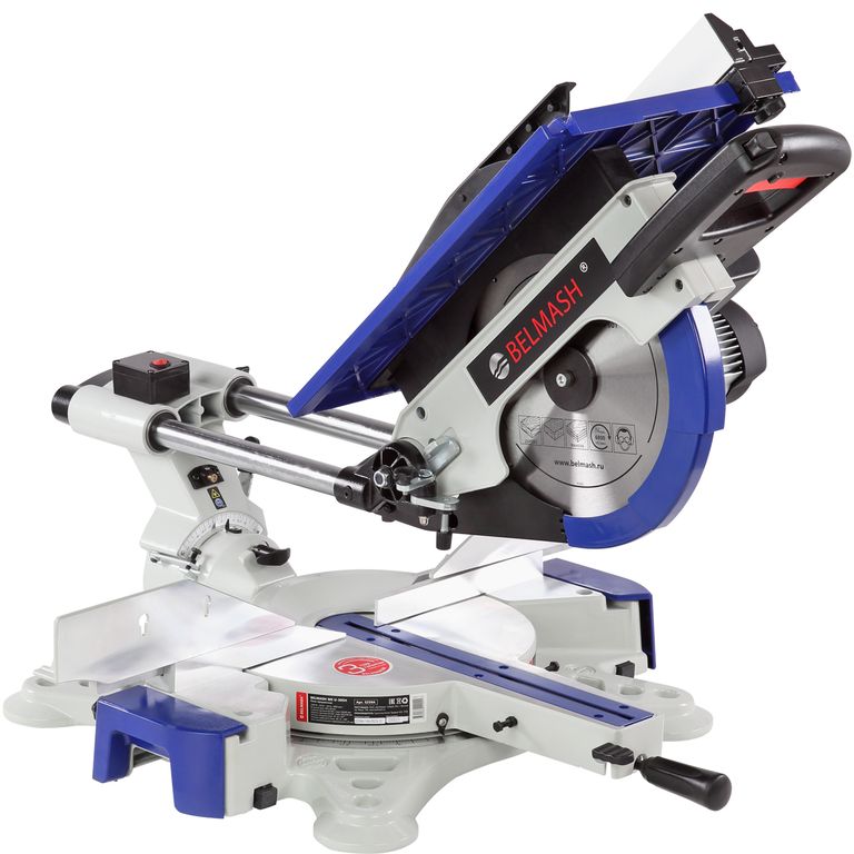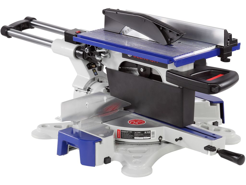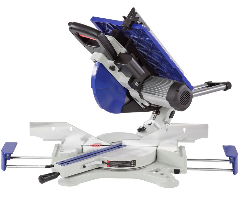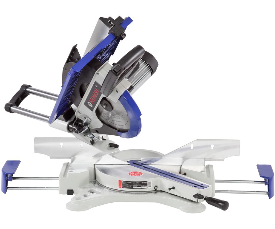 Пила имеет мощный асинхронный двигатель - 2000 Вт. Обороты с вала двигателя к острым головкам передаются с помощью ременной передачи. В качестве острого инструмента используются пильные диски диаметром 305 мм (просадка 30 мм). Пильный узел имеет горизонтальную протяжку 275 мм, что позволяет отрезать деталь до 335 мм. В пильном соединении предусмотрена функция наклона в обе стороны от -45 до 45 градусов.