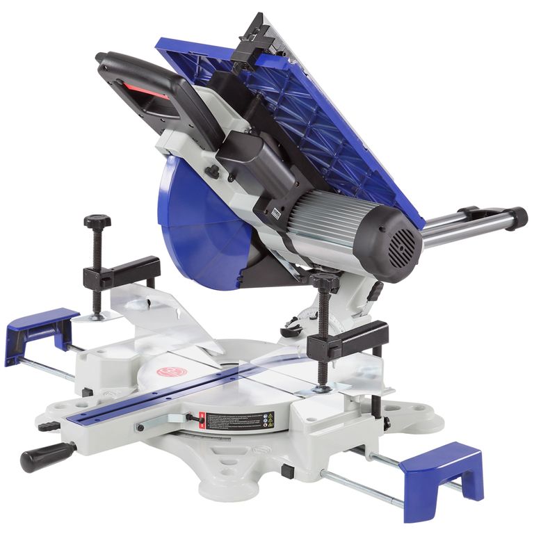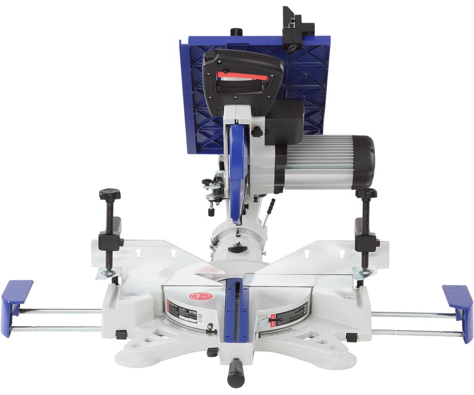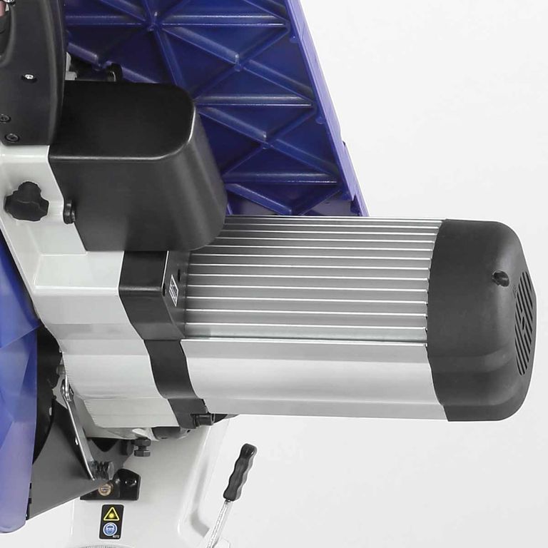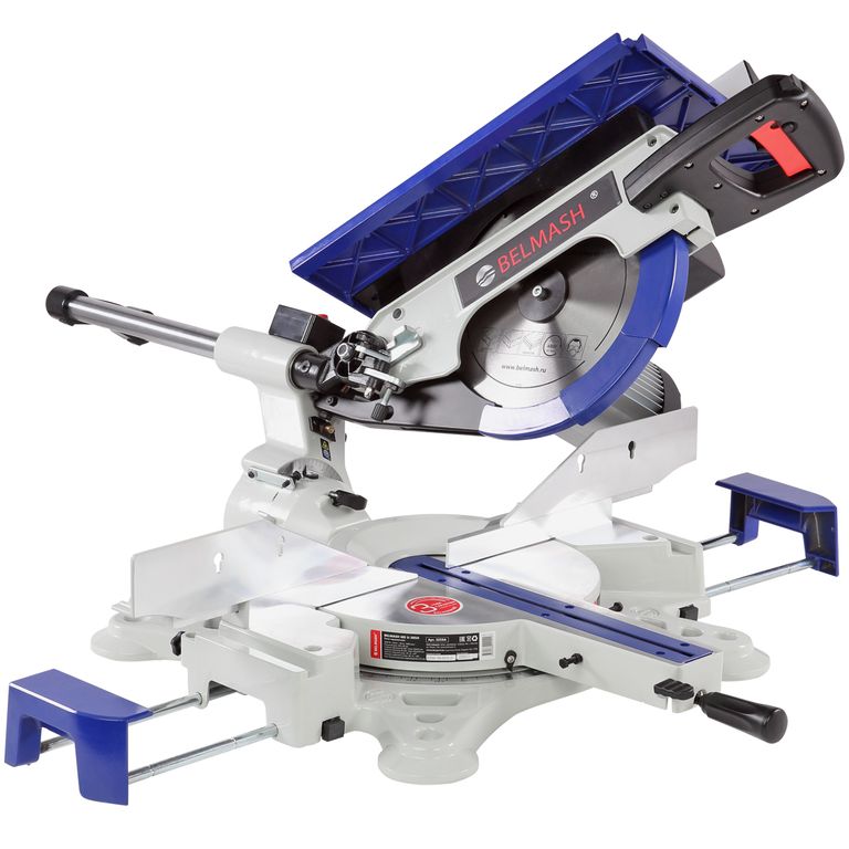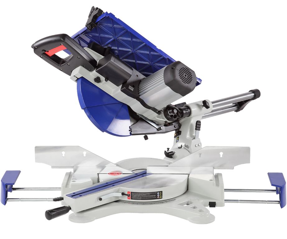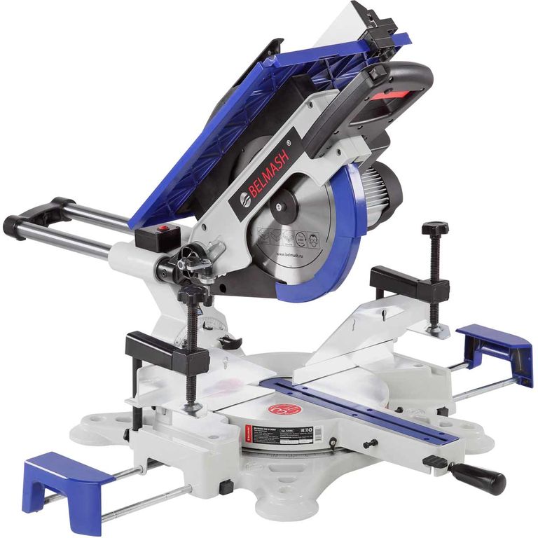 Пила имеет мощный асинхронный двигатель - 2000 Вт. Обороты с вала двигателя к острым головкам передаются с помощью ременной передачи. В качестве острого инструмента используются пильные диски диаметром 305 мм (просадка 30 мм). Пильный узел имеет горизонтальную протяжку 275 мм, что позволяет отрезать деталь до 335 мм. В пильном соединении предусмотрена функция наклона в обе стороны от -45 до 45 градусов.