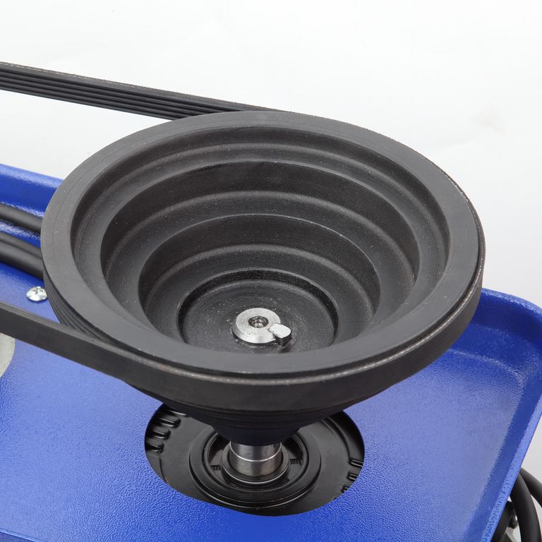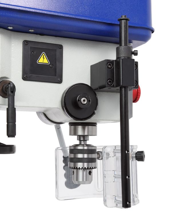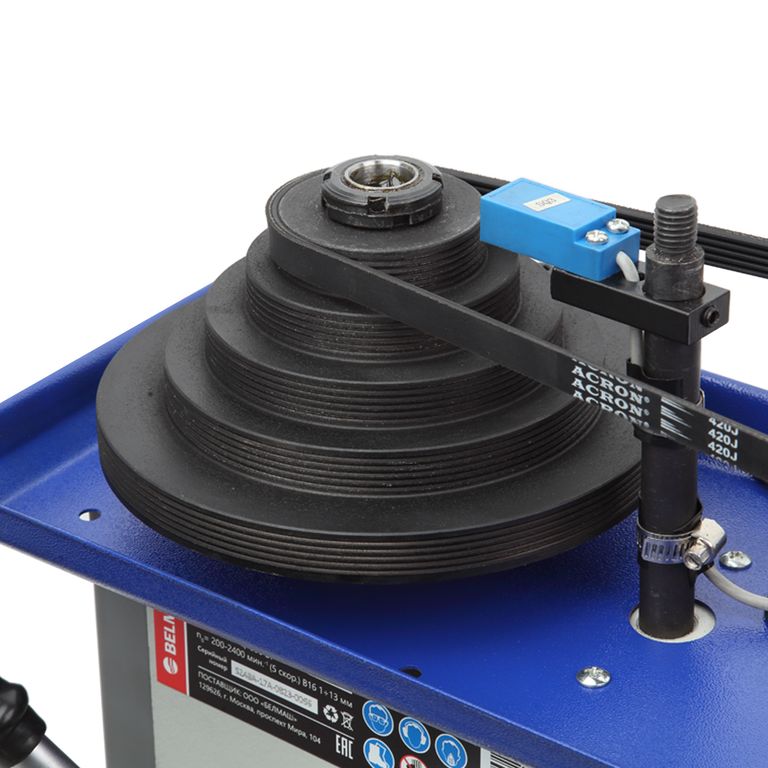 Станок способен сверлить отверстия с максимальным диаметром до 13 мм (в металле) и до 50 мм (в древесине). Патрон ключевой трехкулачковый, с возможностью установки инструмента с хвостовиком до 13 мм. Вращающий момент с вала двигателя на шпиндель передается с помощью клиноременной передачи. Скоростей у данной модели пять: 200, 580, 960, 1550 и 2400 об./мин. Изменить частоту вращения можно переброской ремня на нужную ступень шкивов.