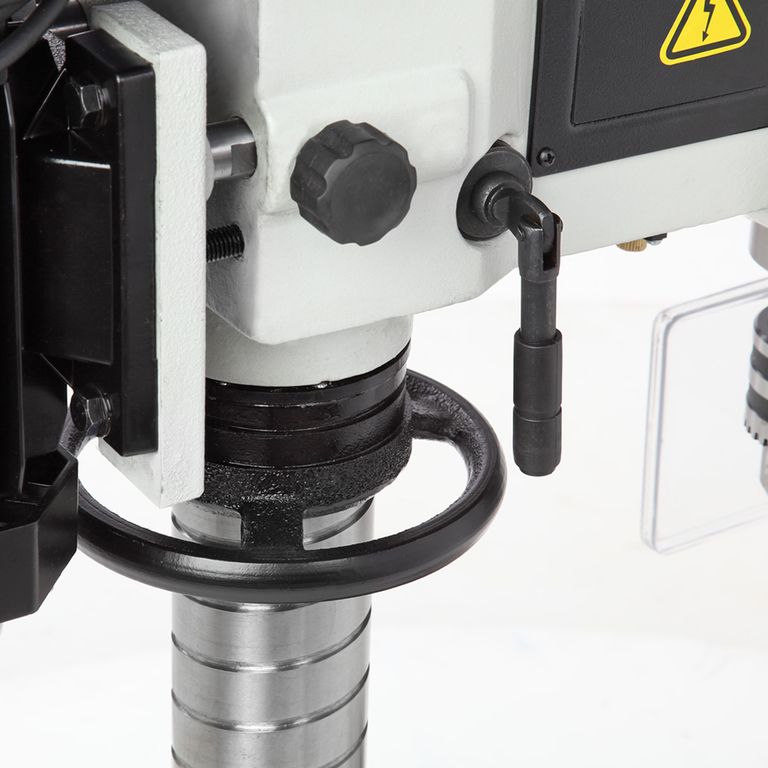 Максимальное расстояние между шпинделем и основанием составляет 530 мм, расстояние от колонны до оси шпинделя составляет 205 мм. Колонна стальная, толстостенная, имеет диаметр 70 мм и толщину стенки - 5.5 мм. Сверление заготовок осуществляется с помощью опускания пиноли, ее ход составляет 90 мм.