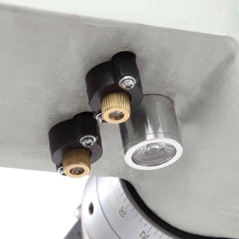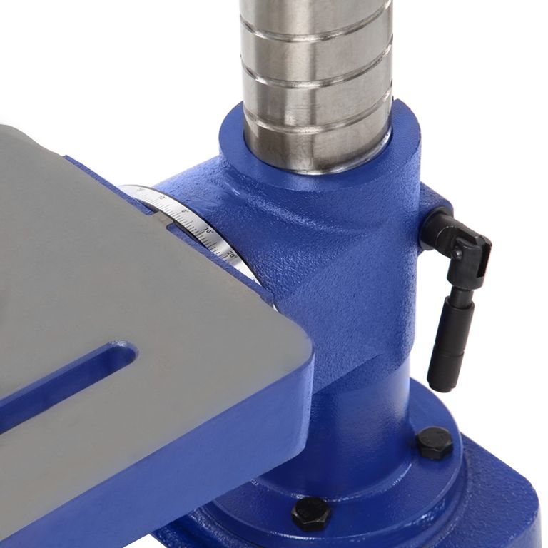 Рабочий стол имеет размер 277×246 мм, возможность наклона от - 45 до +45 градусов, регулировку по высоте и два паза под установку тисков (входят в комплект поставки) или других зажимов. Стол способен выдерживать нагрузку до 30 кг. Основание станка - это не только надежная опора, но и рабочая поверхность 345×520 мм, а Т-образные пазы позволят надежно закрепить заготовку.