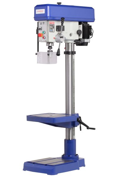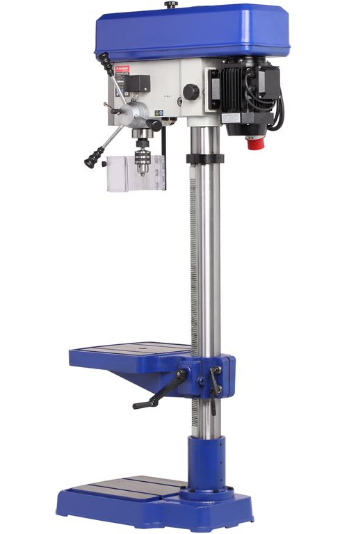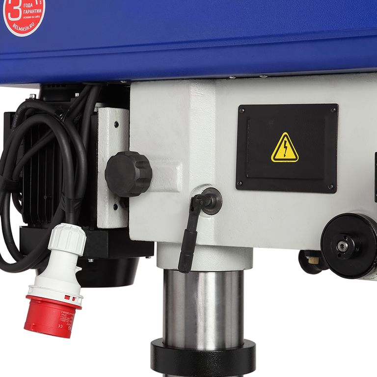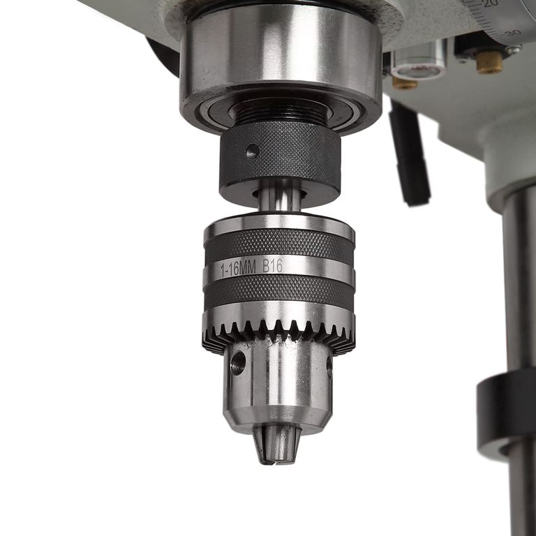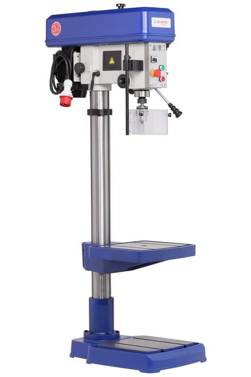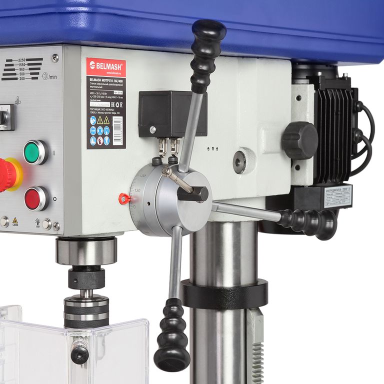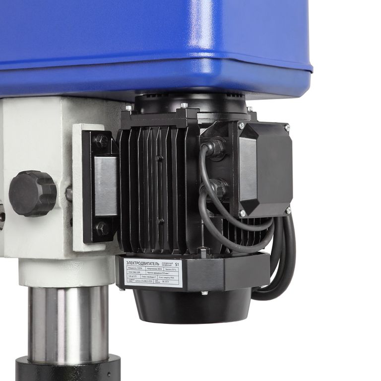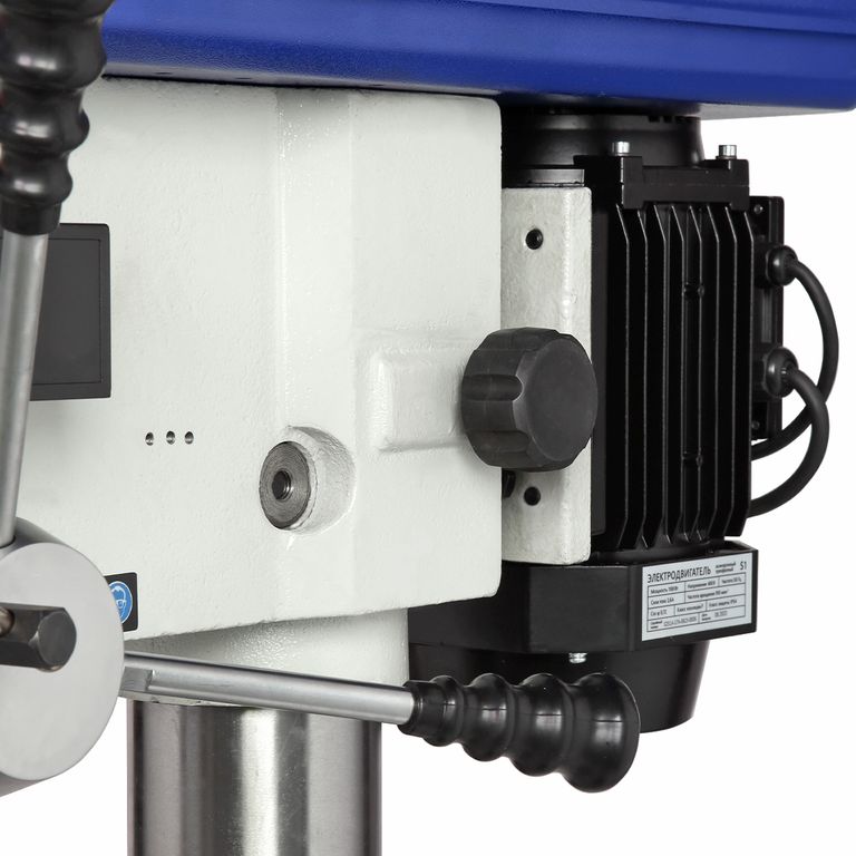 Станок способен сверлить отверстия с максимальным диаметром до 32 мм (в мягких металлах), до 28 мм (в твердых металлах) и до 70 мм (в древесине). Максимальный диаметр нарезания резьбы - М16. Патрон ключевой трехкулачковый, с возможностью установки инструмента с хвостовиком до 16 мм. Вращающий момент с вала двигателя на шпиндель передается с помощью поликлиновой передачи. Скоростей у данной модели пять, от 200 до 2250 об./мин. Изменить частоту вращения можно переброской ремня на нужную ступень шкивов.