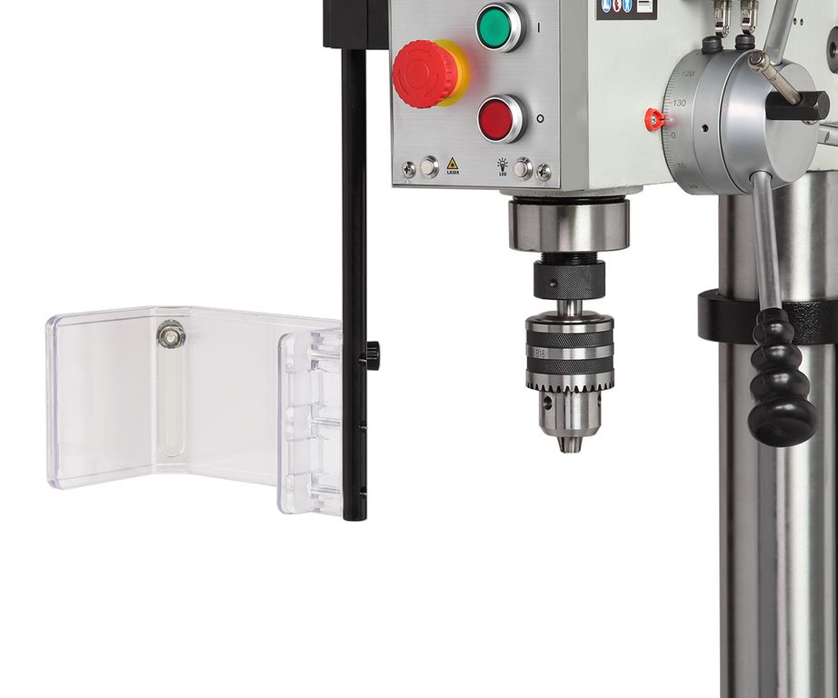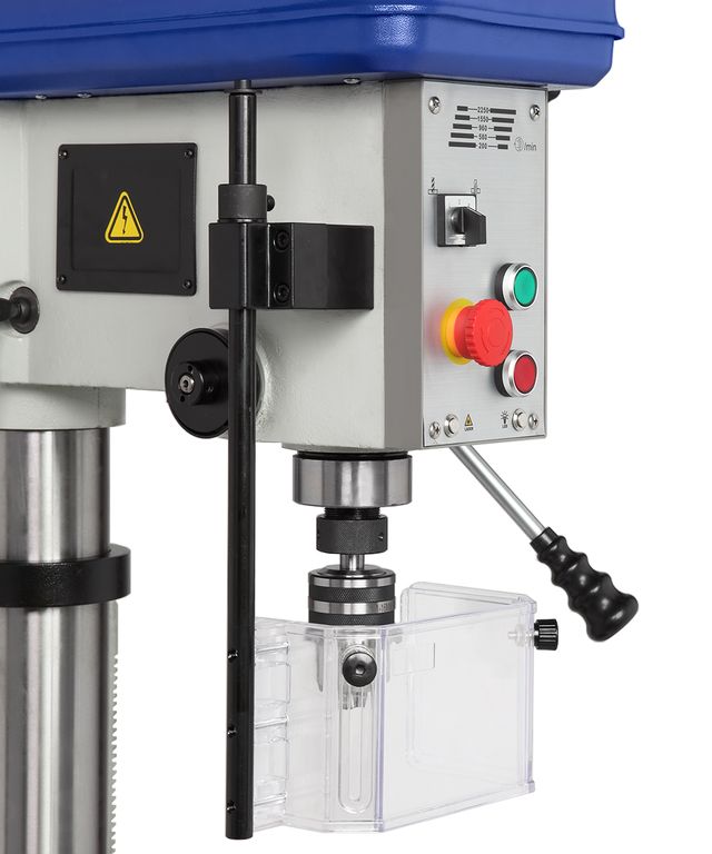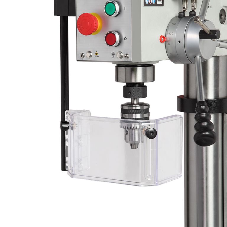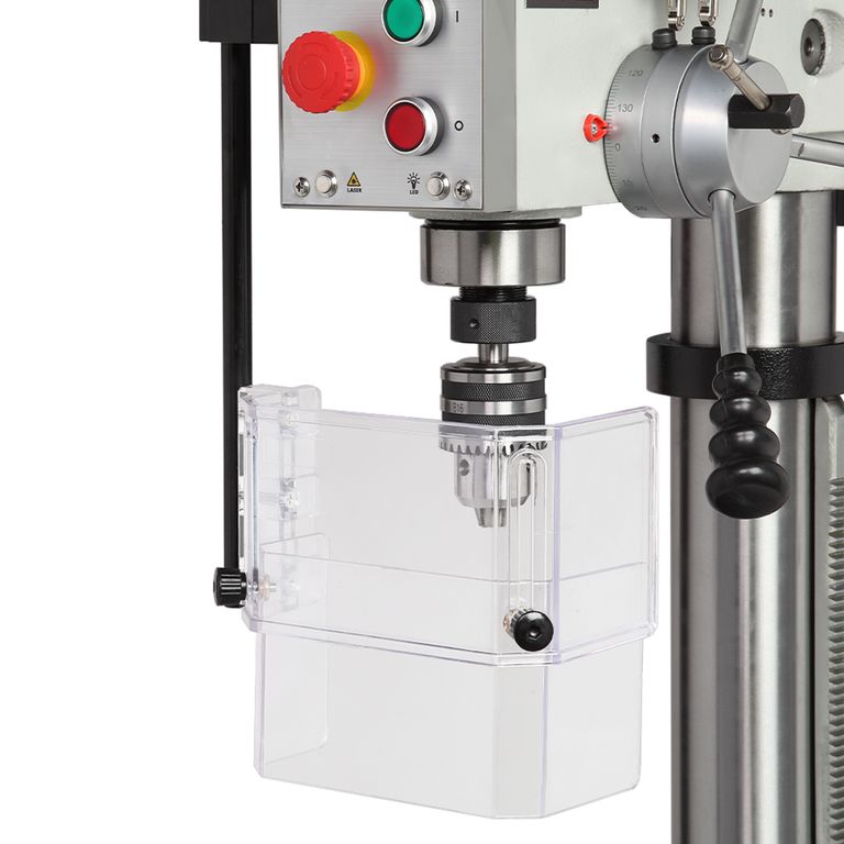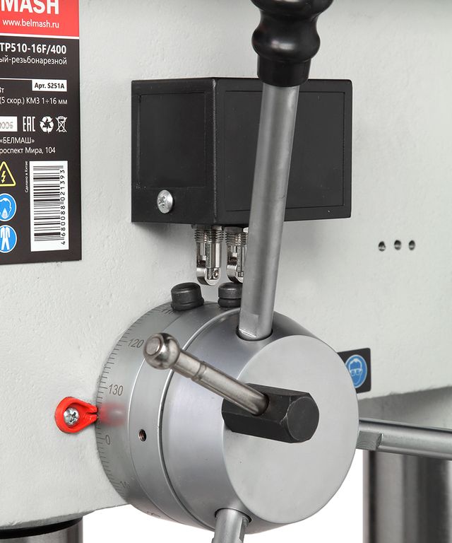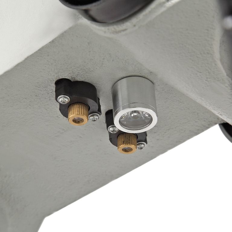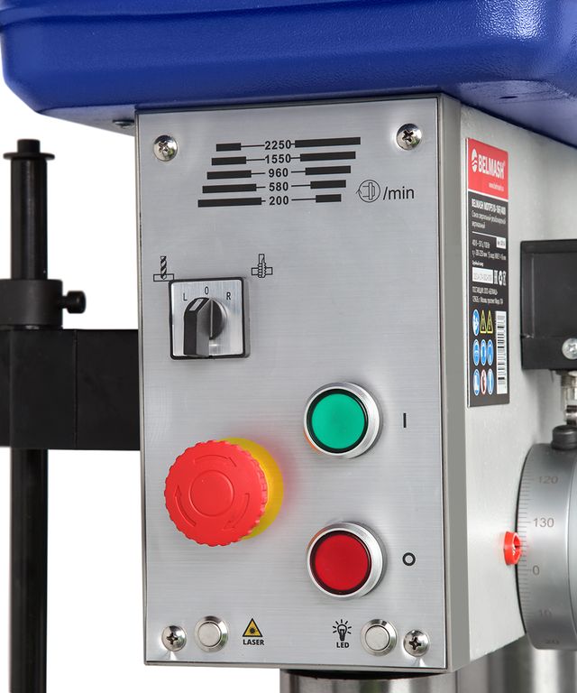 Элементы управления станком выведены на переднюю часть сверлильной головки. Это кнопки включения и выключения, кнопка аварийной остановки. Для точного позиционирования в конструкции этой модели предусмотрены лазерный указатель и подсветка.