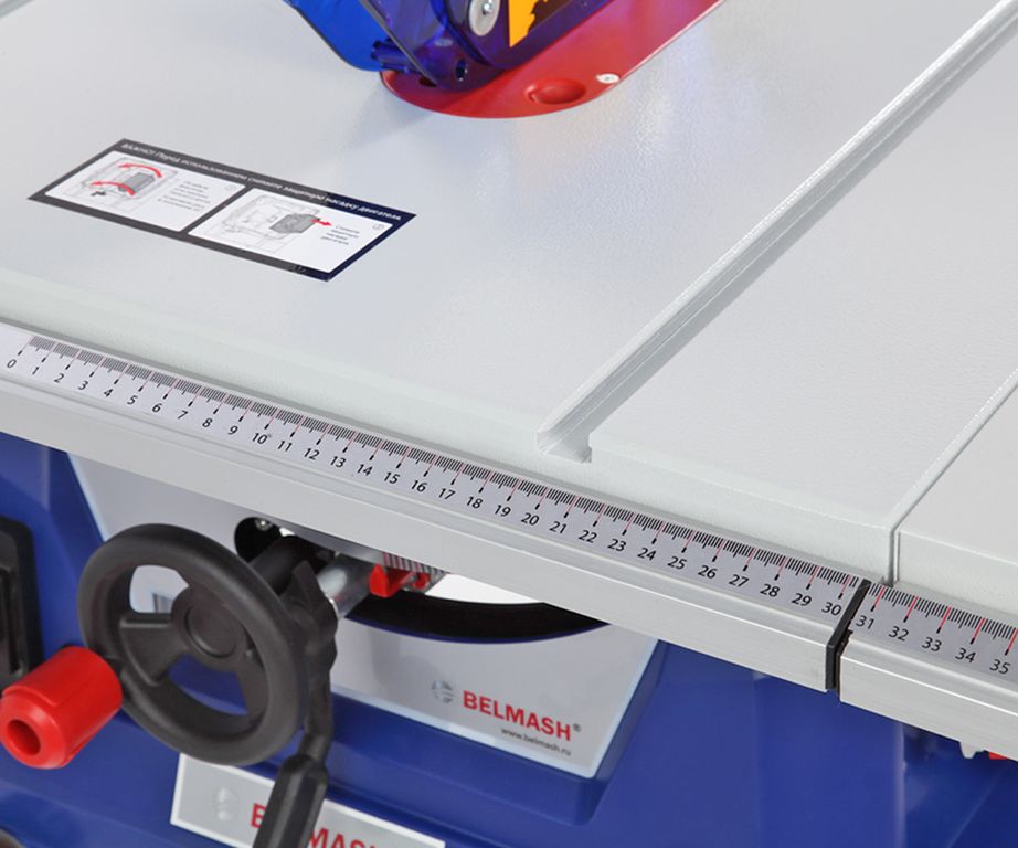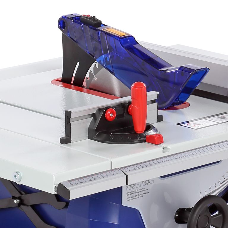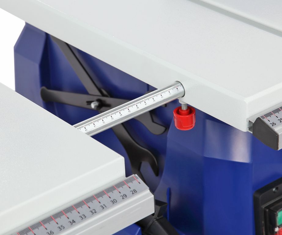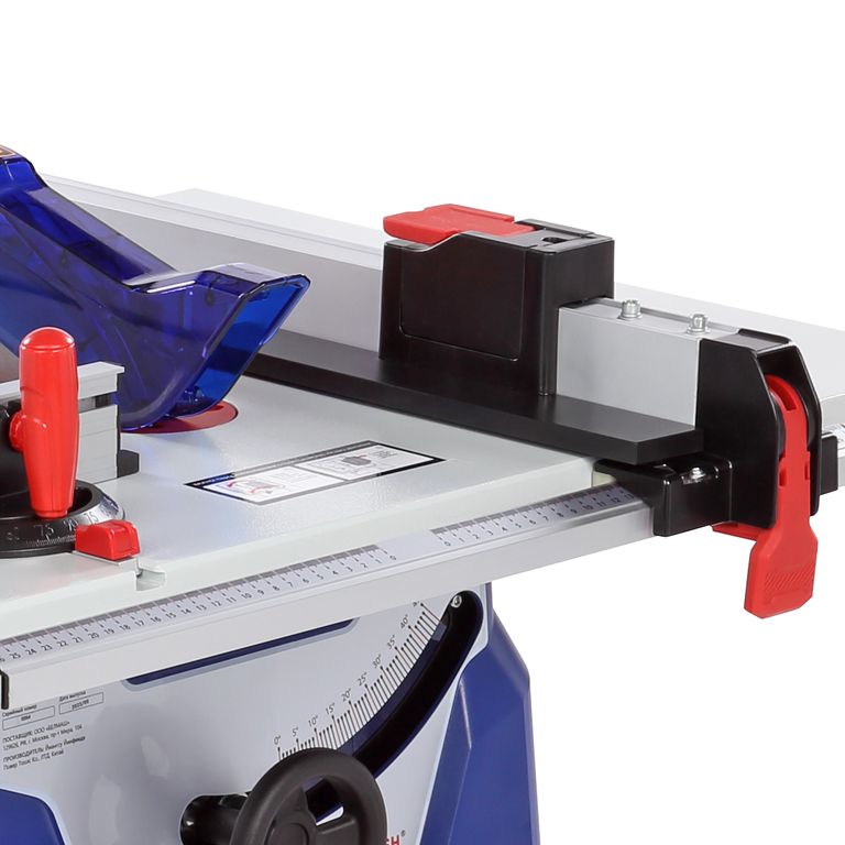 Параллельный упор также можно поставить как справа, так и слева от пильного диска. На передней направляющей параллельного упора есть шкалы для точного позиционирования. Шкалами снабжены и штанги боковых столов. В комплектации этой модели есть дополнительное приспособление - упор для работы с узкими заготовками. он устанавливается как накладка на параллельную направляющую. Корпус изделия закрытый, изготовлен из пластика. Снабжен специальными держателями для упоров, толкателя, ключей и пильного диска.