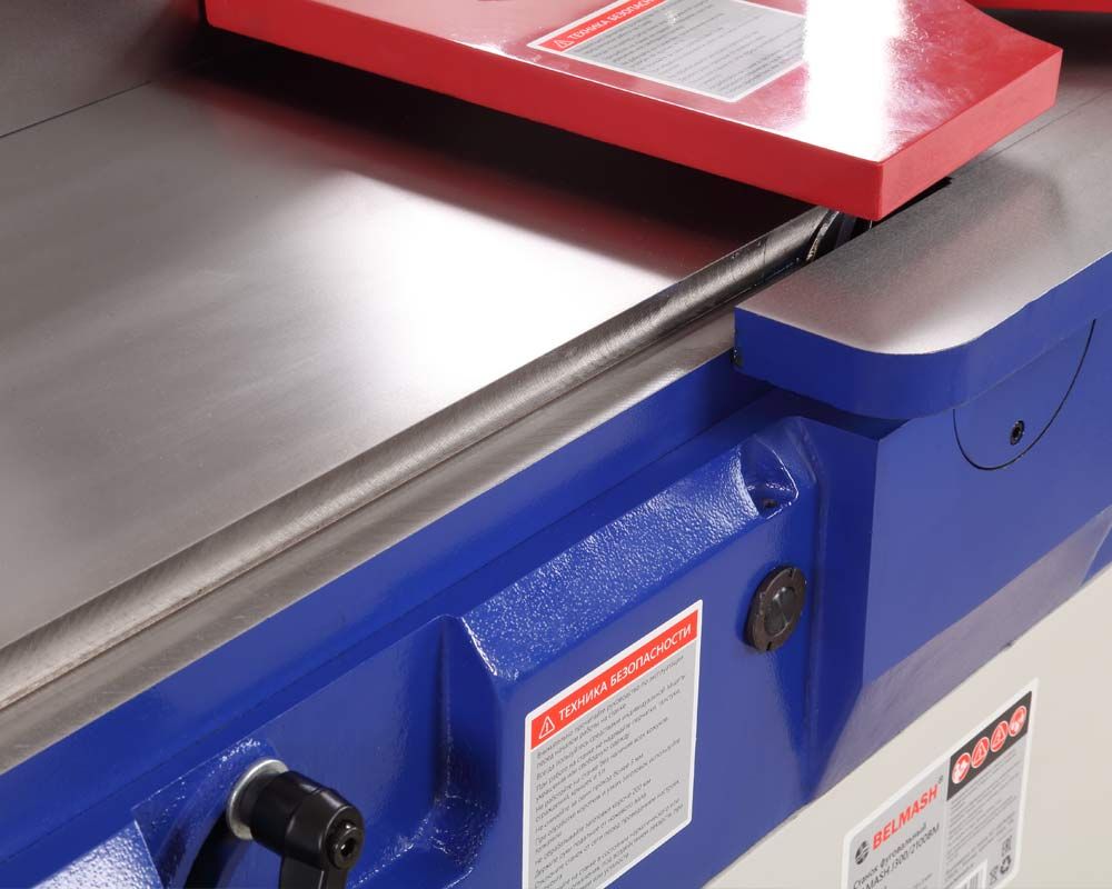305 мм ширина обработки - самая большая среди станков BELMASH. Рабочие столы имеют общую длину 2240 мм, загрузочный 1036 мм, приемный 1036 мм. Длинные столы обеспечивают прямолинейность. Даже довольно габаритная заготовка, уложенная на них, будет иметь надежную опору. Оператору остается только перемещать ее в горизонтальной плоскости и немного прижимать к поверхности стола.