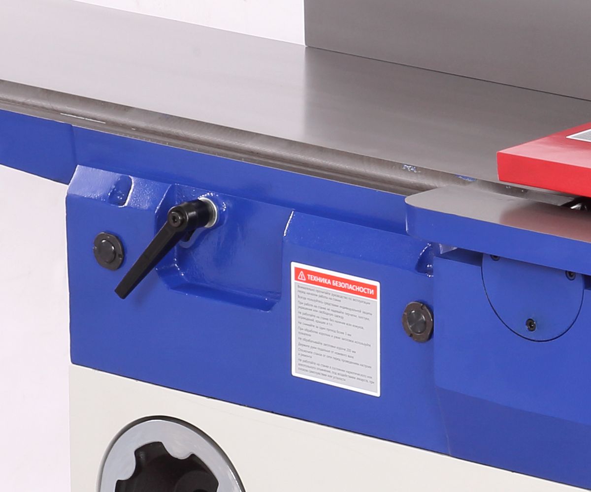Регулировка положения столов осуществляется индивидуальными маховиками. Глубина строгания до 3 мм, для точной регулировки на станке размещена шкала с указателем.