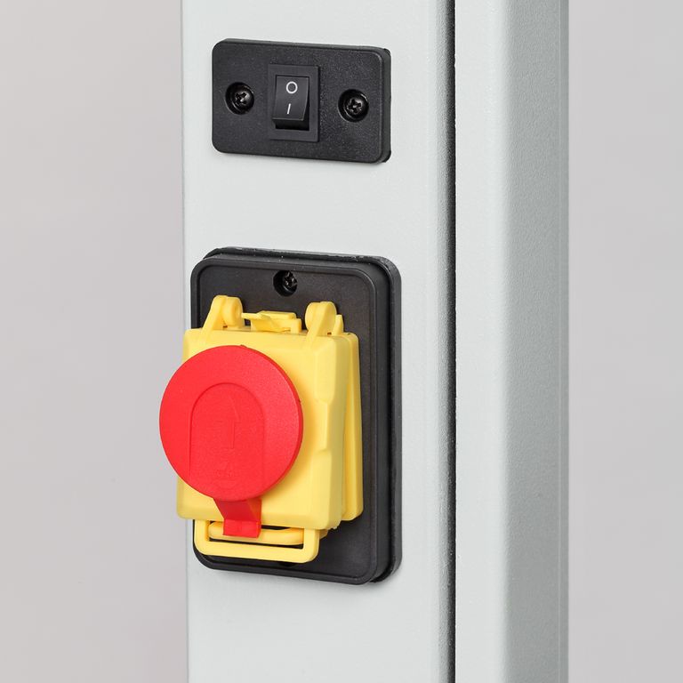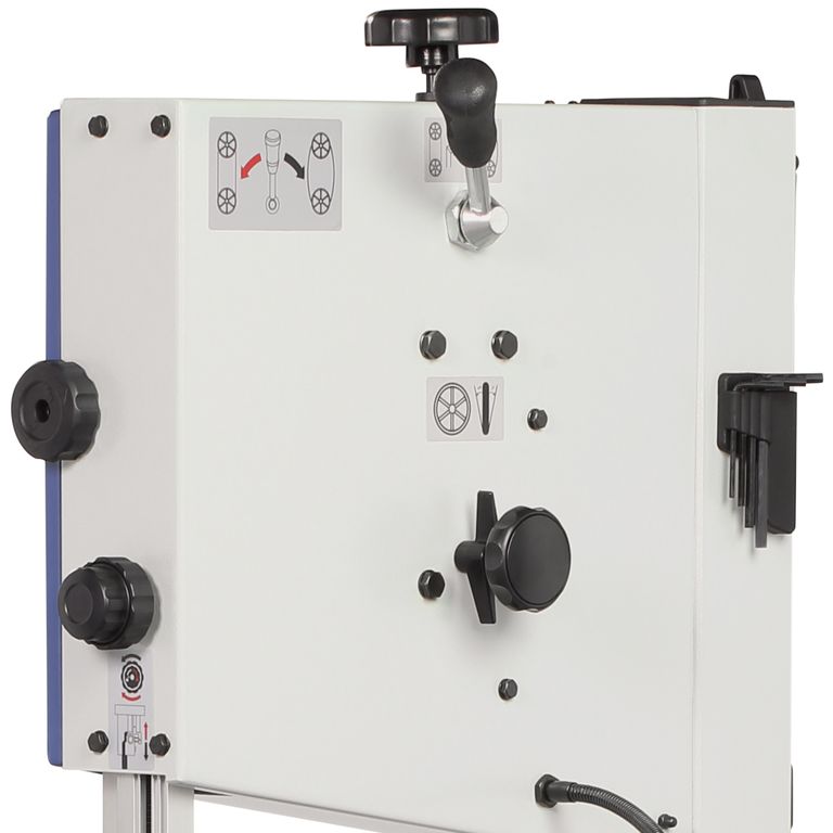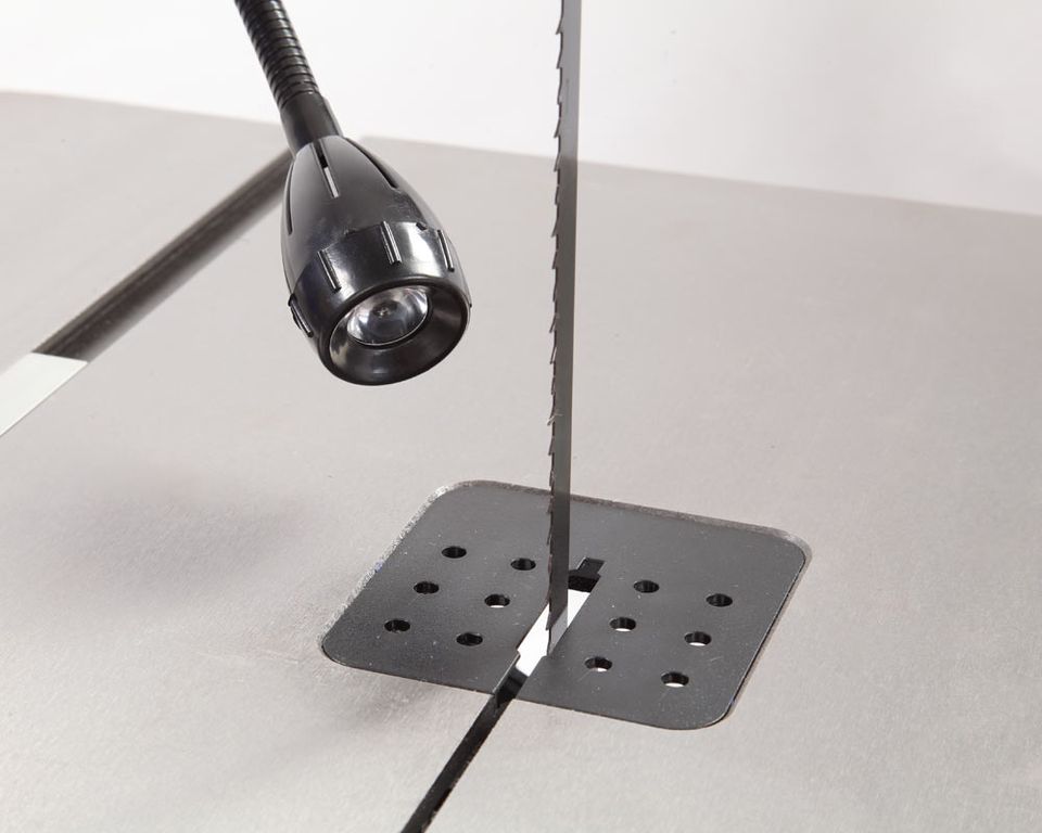 Станок имеет отличную базовую комплектацию. Для подсветки рабочей зоны предназначена светодиодной лампа на гибком держателе. Ее выключатель выведен на раму над выключателем станка. Модель оборудована устройством для резки кругов. Станок можно устанавливать как на верстак, так и на подставку. В нижней части рамы предусмотрен ящик для сбора отходов резания. На раме так же имеются специальные крепления для размещения углового упора, толкателя и шестигранных ключей. А благодаря колесам и ручке станок удобно перемещать по мастерской.