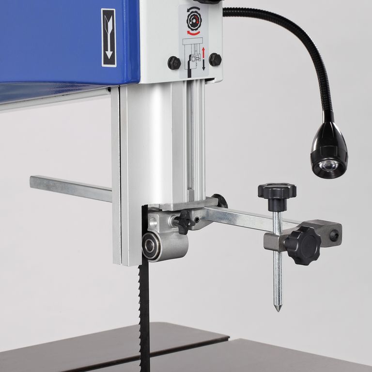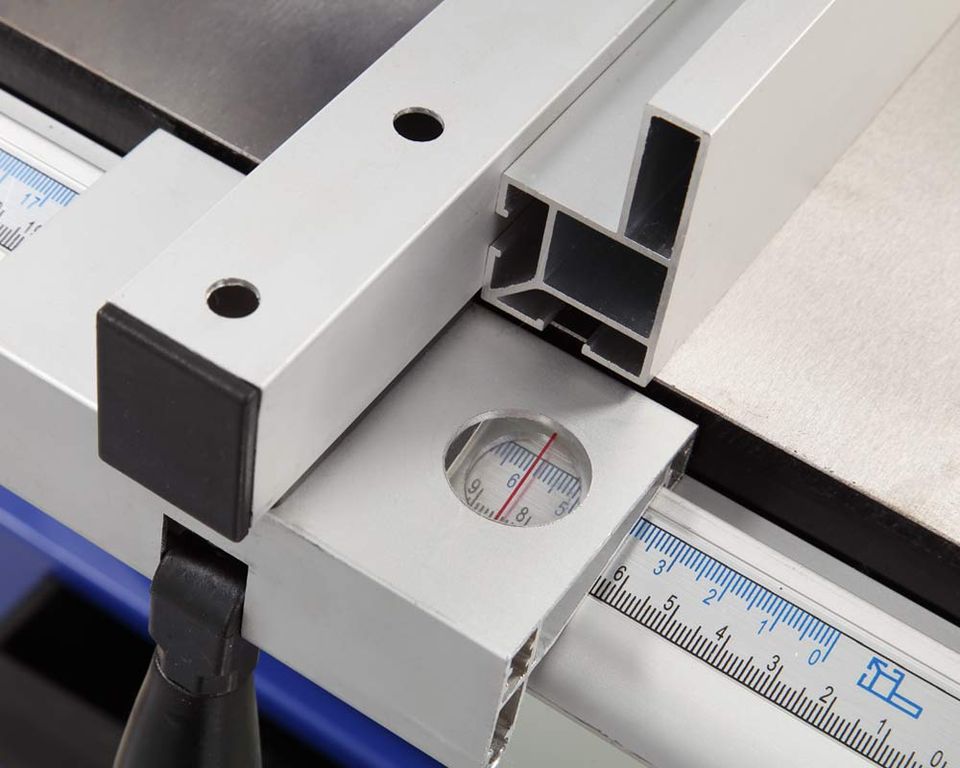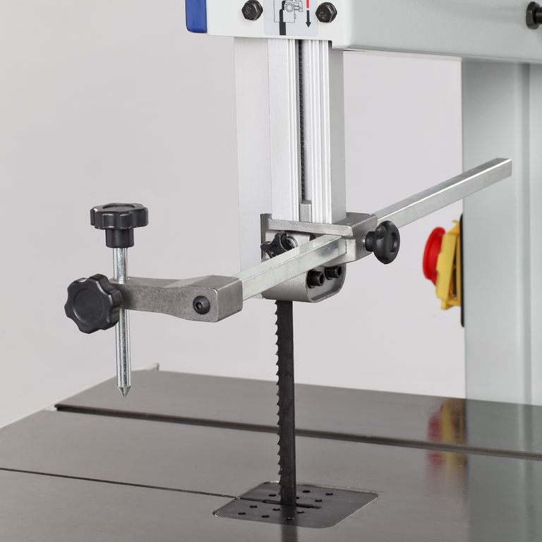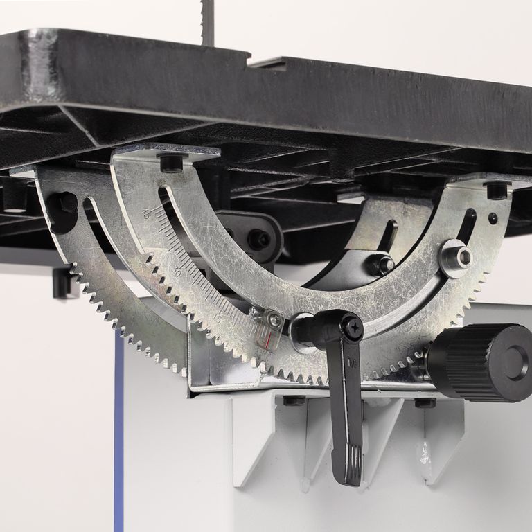 Рабочий стол изготовлен из чугуна, имеет размер 545×515 мм, возможность наклона до 45 градусов и два Т-образных паза для установки углового упора (по обе стороны от пильного полотна). Спереди на стол крепится передняя направляющая. На ней находятся шкалы, показывающие точное положение. Параллельный упор фиксируется эксцентриковым зажимом. Параллельную направляющую упора можно установить как вертикально, так и горизонтально в зависимости от высоты обрабатываемых заготовок. Максимальная высота заготовки - 220 мм, просвет до рамы - 340 мм.