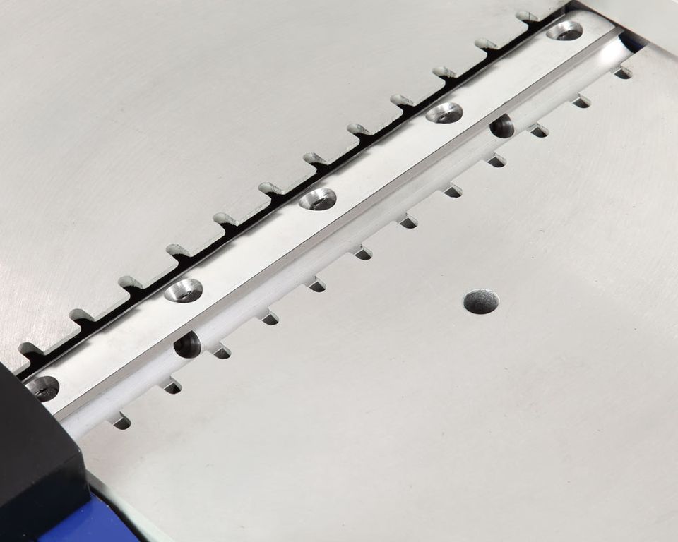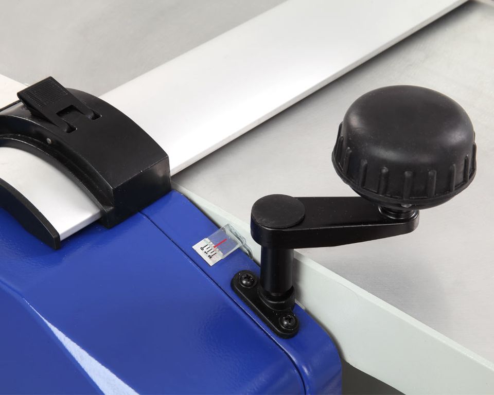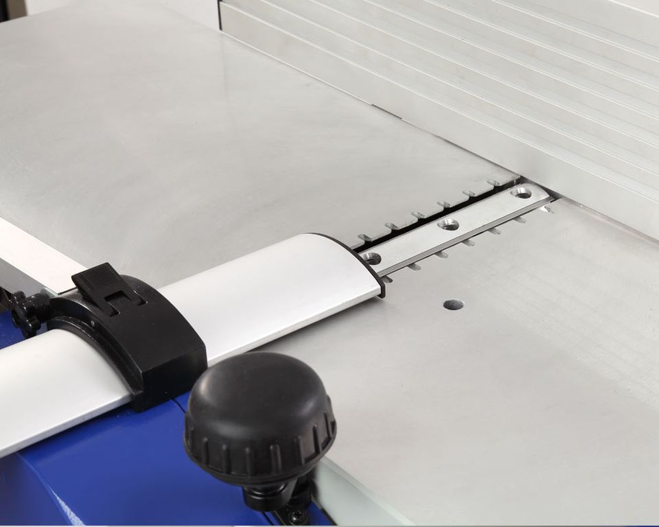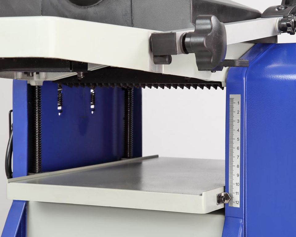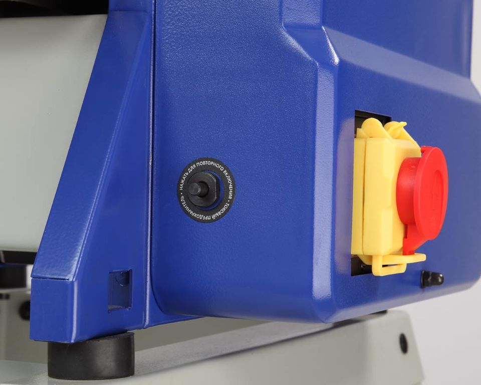 Модель имеет настольное исполнение. Корпус сборный, выполнен из стали. Верхние столы предназначены для строгания/фугования заготовок. Нижний рабочий стол –для рейсмусования. Строгальные и рейсмусовые столы, параллельный упор выполнены из алюминия. Угол наклона упора регулируется. Нужная высота настраивается с помощью рукоятки. Вал оснащен двумя ножами. Удаление отходов резания осуществляется через съемный кожух. Имеется токовая защита. Размер рейсмусового стола 380×254 мм.