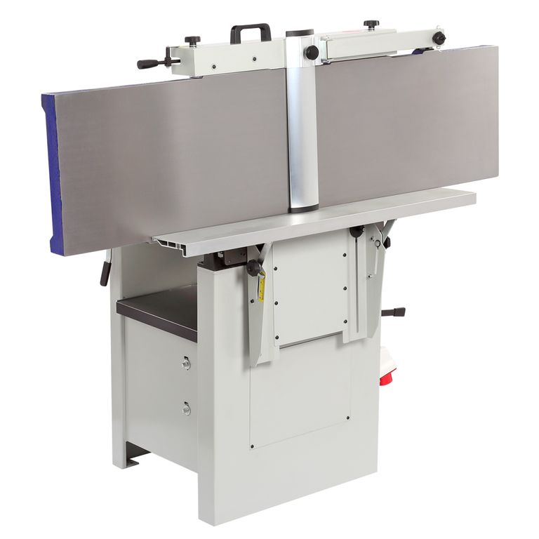 Конструкция станка – одна из самых удачных на рынке: широкое использование массивных чугунных деталей и большой вес гарантирует точную работу без вибраций. При рейсмусовании верхний модуль целиком поднимается и не мешает ни работе, ни стружкоудалению. Отдельного внимания заслуживает удобный эксцентриковый механизм регулировки положения столов, причем как подающего, так и принимающего.