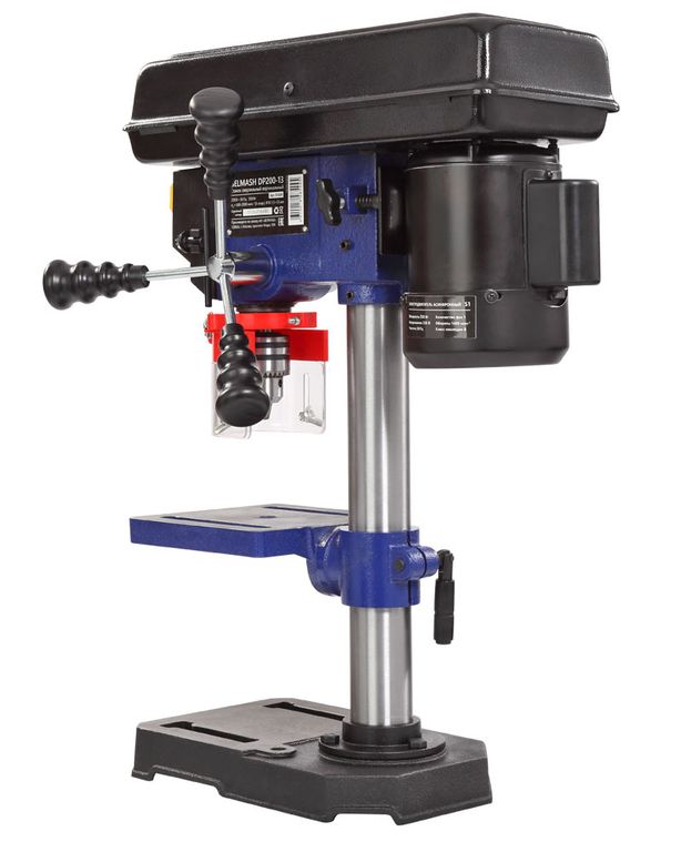 Модель DP200-13 самая компактная и простая. Стол, опора и корпус сверлильной головки выполнены из чугуна, что делает станок устойчивым. При скромных размерах вес составляет 15 кг. Двигатель асинхронный, мощностью 350 Вт.