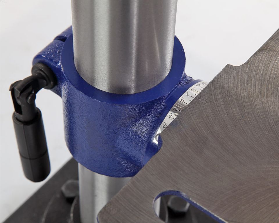 Заготовку можно крепить как к рабочему столу, так и к основанию, все зависит от ее размера. В комплекте предусмотрены тиски. Для их крепления есть по два паза на рабочем столе и на основании. Шкала, расположенная слева от выключателя, показывает ход пиноли шпинделя. Наконечники тройной рукояти удобной формы, что способствует плавной подаче сверла к заготовке.