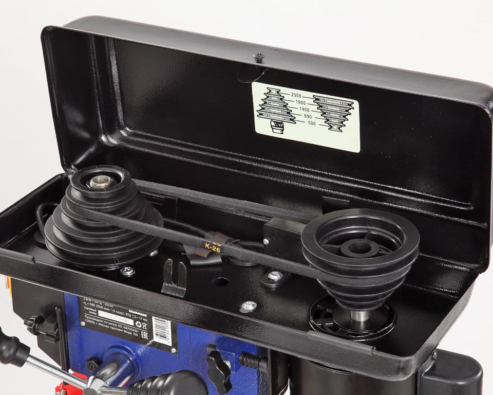 Имеется пять ступеней скорости вращения шпинделя, что необходимо при выполнении различных операций и типах материала. Переключение производится за счет переброски ремня. Для этого необходимо открыть крышку ременного отсека, ослабить барашек крепления двигателя, тем самым получив возможность смещения шкива, перекинуть ремень и проделать операцию в обратной последовательности.