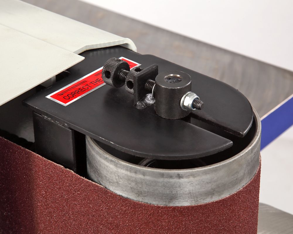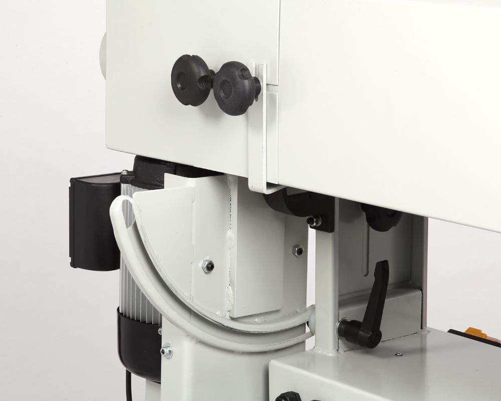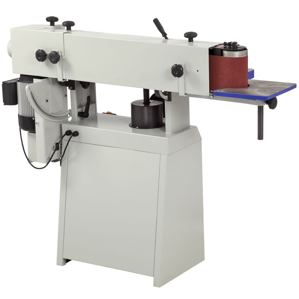 В движение ленту приводит трехфазный асинхронный двигатель мощностью 2200 Вт. Ее скорость движения 16 м/с. Механизм осцилляции улучшает качество процесса шлифования. Амплитуда колебаний -12,5 мм. Поэтому при ширине ленты 152 мм максимальная высота обработки составляет 160 мм. Рабочие столы выполнены из чугуна и прошли фрезерное шлифование, имеют регулировку по высоте. В паз основного рабочего стола можно установить параллельную направляющую или угловой упор. Это позволяют обрабатывать не только канты, но и пласть. Малый стол позволяет совершать шлифование заготовок с внутренним закруглением радиусом до 55 мм.