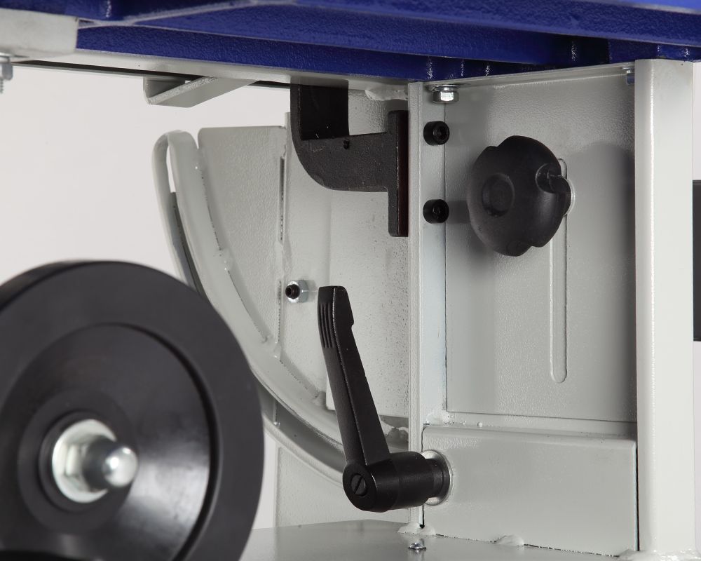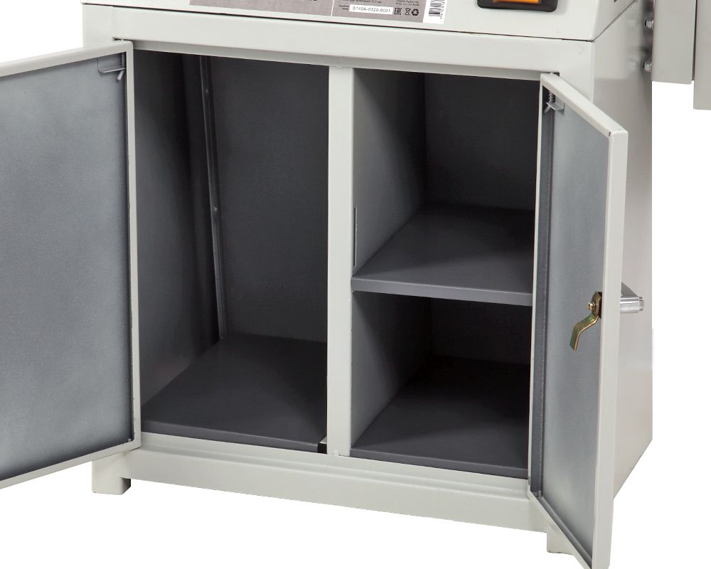 Особого внимания заслуживает основание станка. Оно полностью закрыто и имеет распашные дверки в передней части. Внутри установлена полка, что позволяет использовать пространство под станиной для хранения принадлежностей и инструмента.