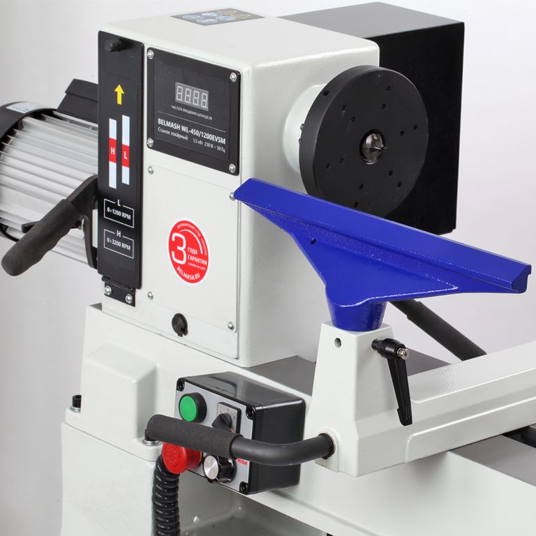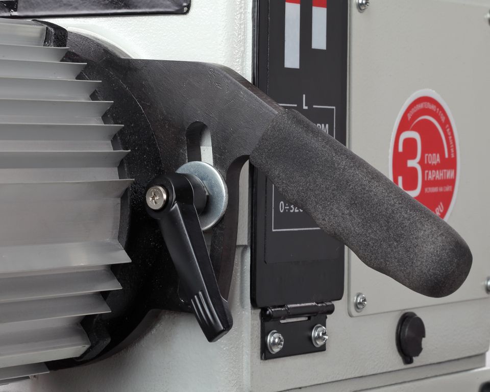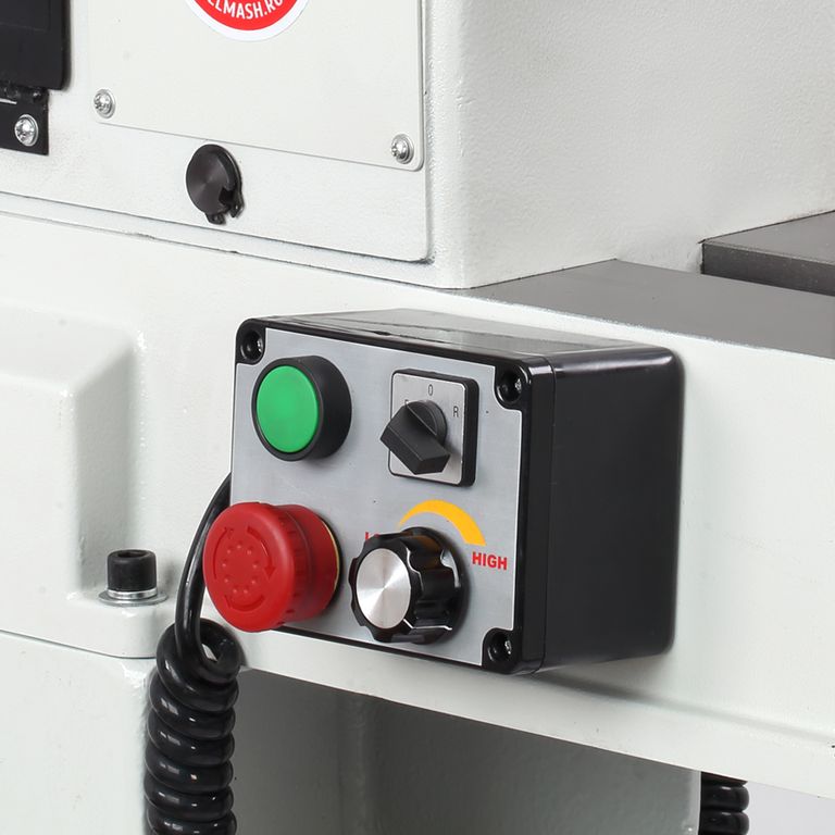 Станок имеет мощный асинхронный двигатель – 1500 Вт. Диапазонов скоростей два: низкий - от 0 до 1200 об./мин., и высокий – от 0 до 3200 об./мин. Скорость регулируется плавно с помощью частотного преобразователя. Отличительная особенность – выносной пульт управления с магнитной фиксацией.