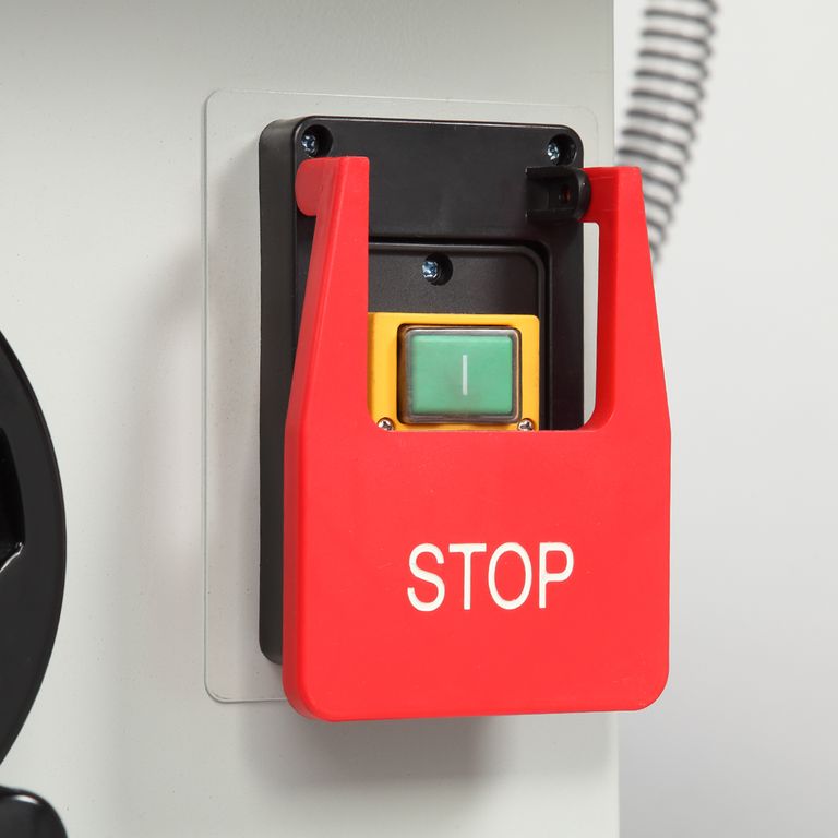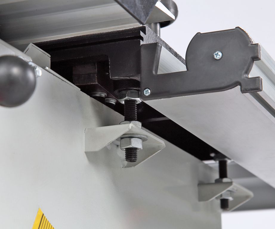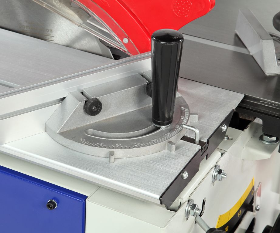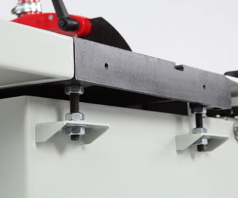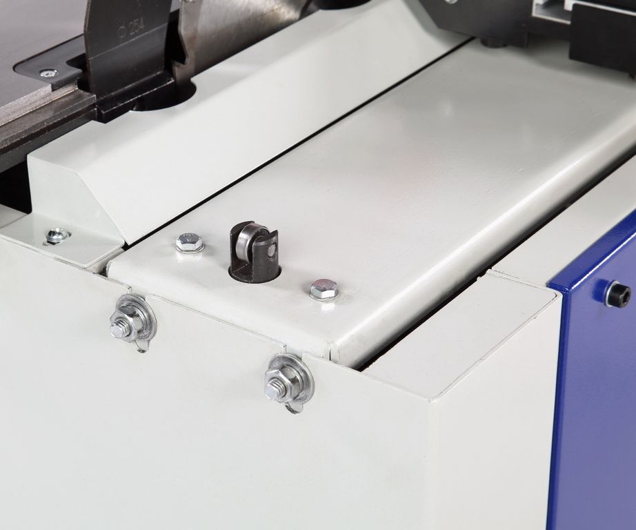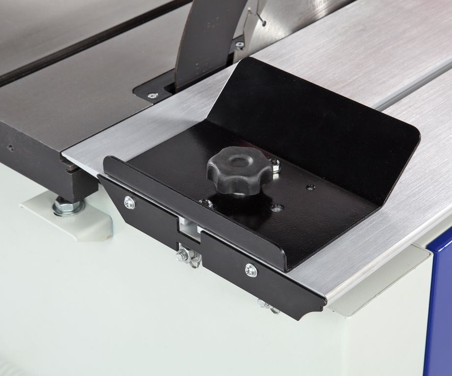 Станок оснащен основным чугунным столом, одним дополнительным столом из листовой стали, подвижным столом из алюминиевого профиля. Основной и подвижный стол имеют по одному пазу для установки угловых упоров или дополнительных приспособлений.