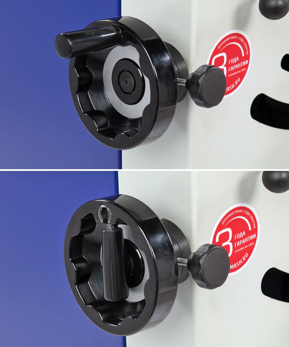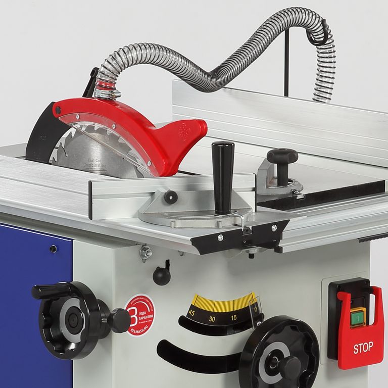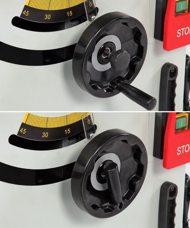 - Высота пропила под углом 90° - 80 мм, 45° - 65 мм. Регулировка угла наклона и высоты пильного диска с помощью маховиков на корпусе станка