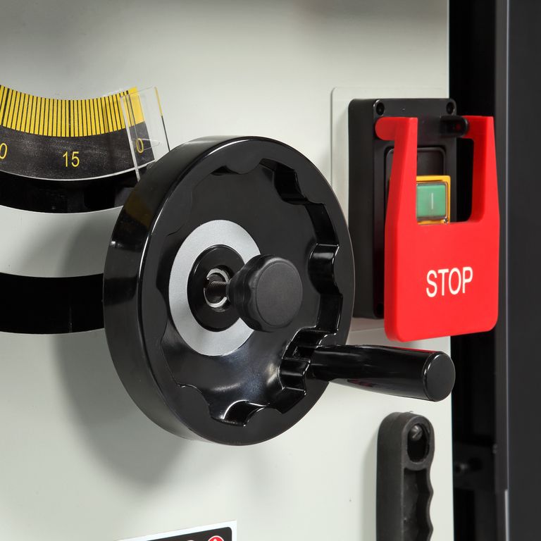 - Высота пропила под углом 90° - 80 мм, 45° - 55 мм. Регулировка угла наклона и высоты пильного диска с помощью маховиков на корпусе станка