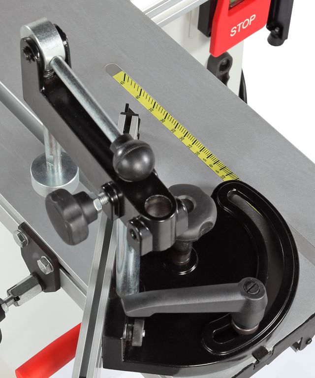 Станок оснащен основным чугунным столом, двумя дополнительными секциями из листовой стали, подвижным столом из алюминиевого профиля и столом поперечного реза из стального профиля. Основной и подвижный столы имеют по одному пазу для установки угловых упоров или дополнительных приспособлений.