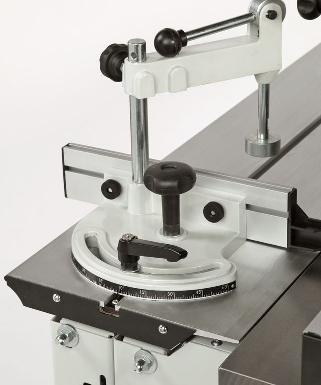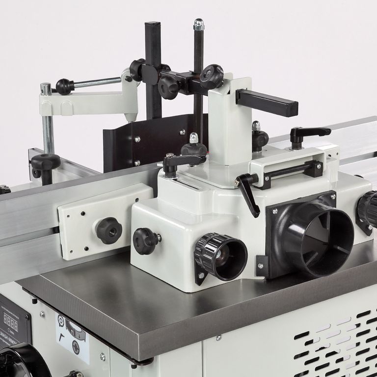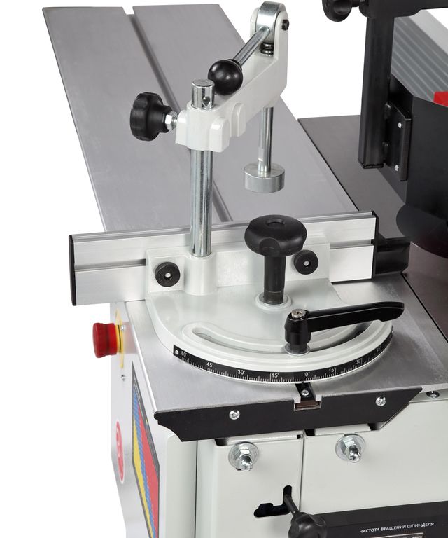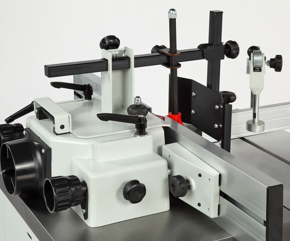 Станок оснащен чугунным рабочим столом и кареткой с подвижным столом. Подвижный стол выполнен из алюминия, в нем имеется стандартный паз под установку углового упора с эксцентриковым зажимом для фиксации заготовок. Корпус изделия закрытый, изготовлен из листовой стали. В комплект поставки входит шпиндель 30 мм и зажимной патрон с тремя цангами (8, 12 и 12,7 мм) и наборные кольца разной высоты. Принадлежности для шлифования и фрезерования являются дополнительными аксессуарами в комплект поставки не входят.