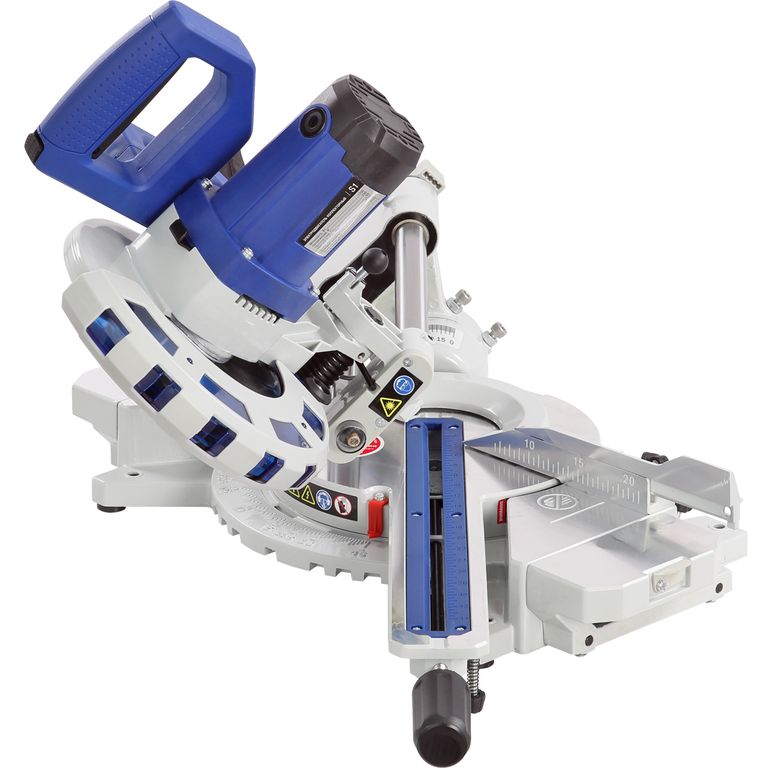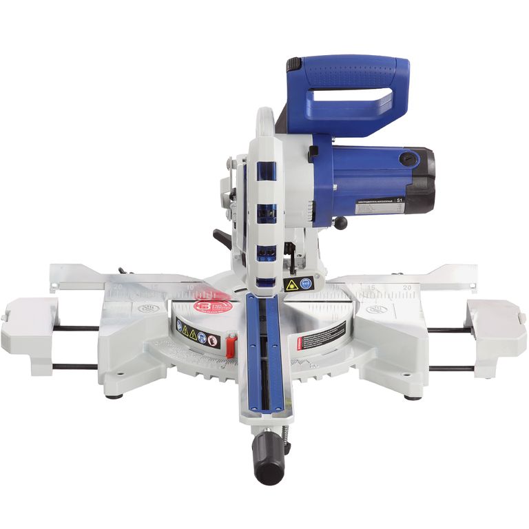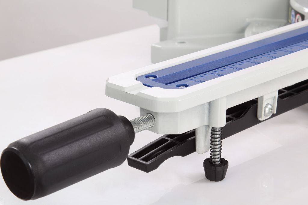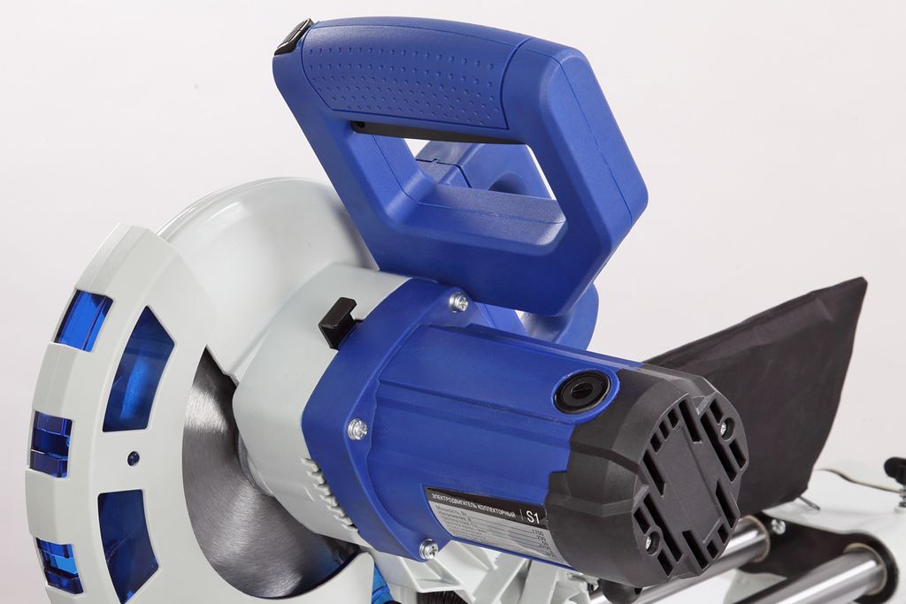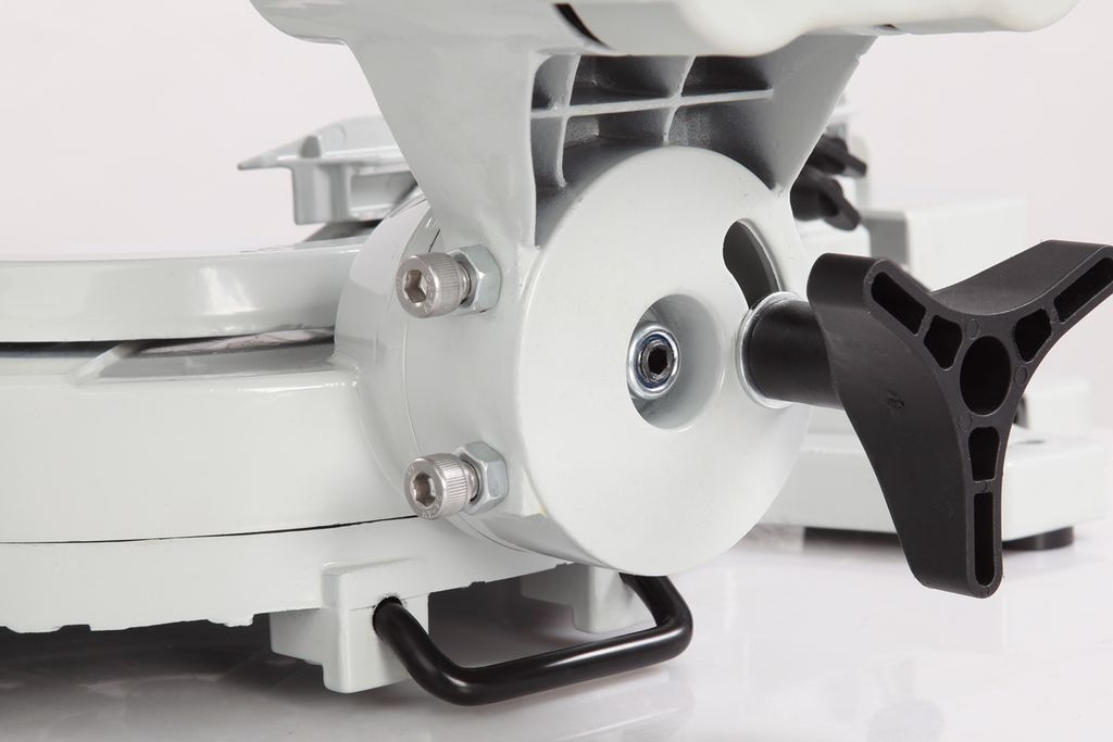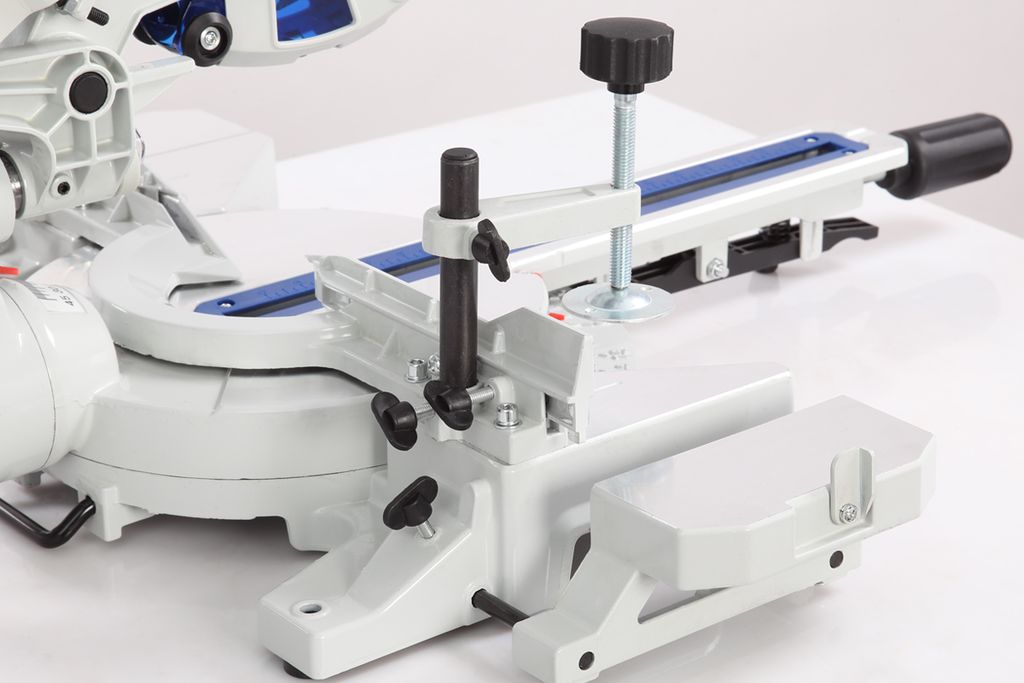 Для дополнительной точности реза предусмотрена лазерная направляющая. В комплекте есть струбцина для фиксации заготовки. Режущая головка с автоматически закрывающимся защитным кожухом. Патрубок для отвода отходов резания позволяет подключить вытяжное устройство.