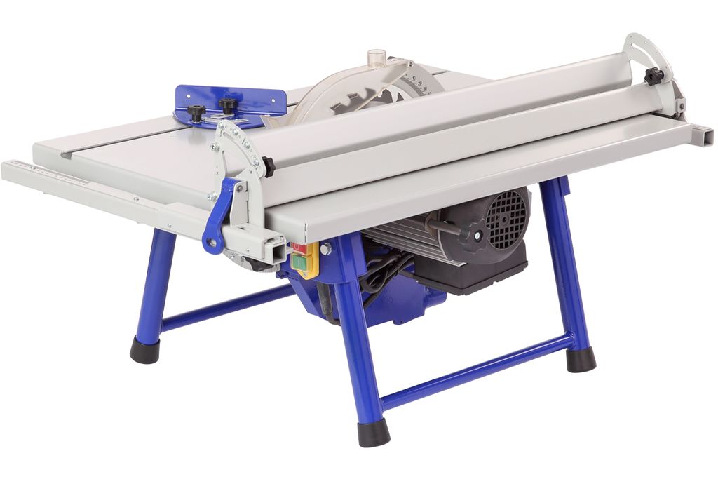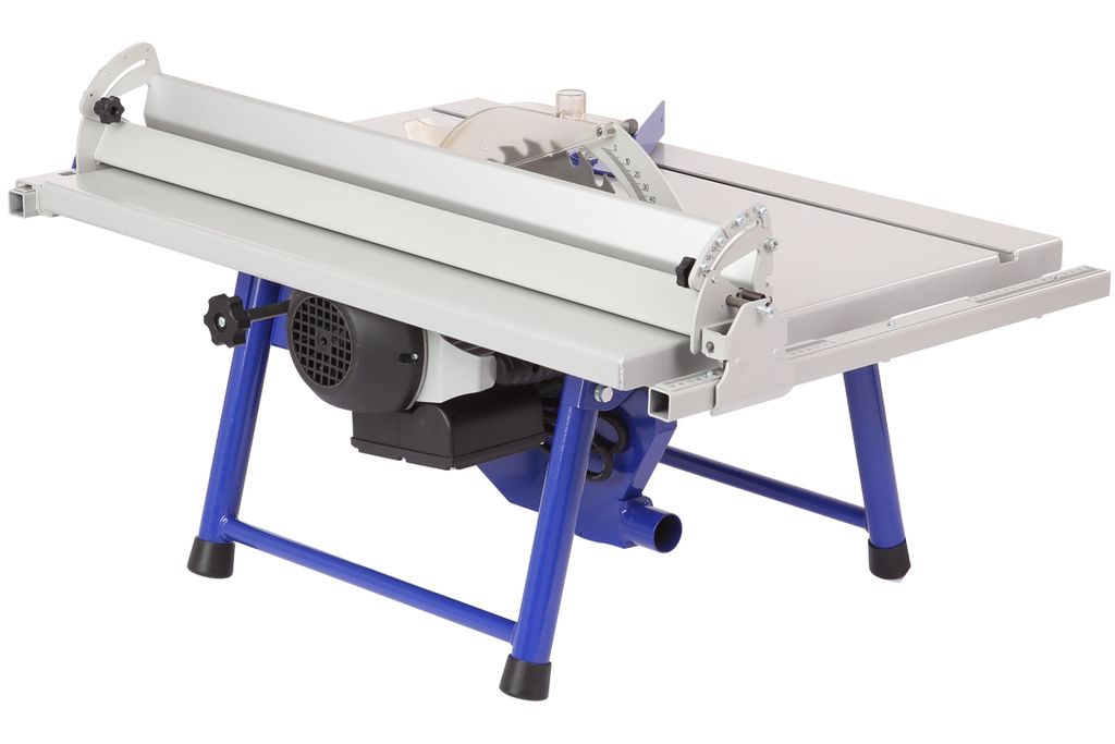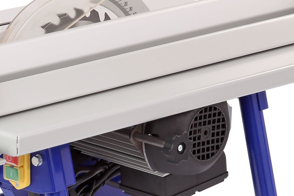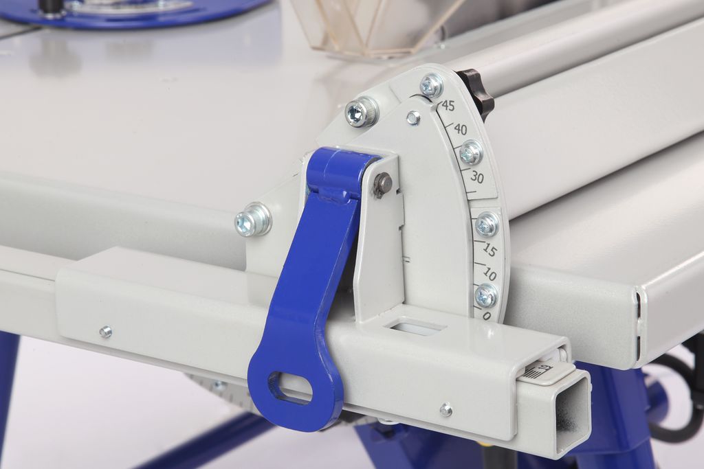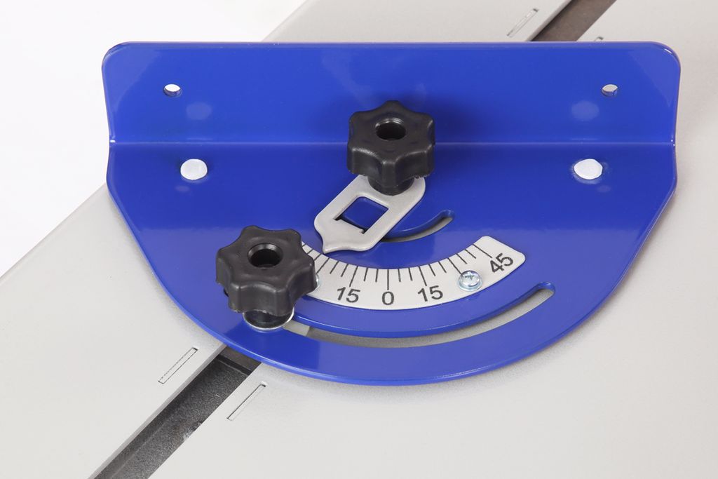 Стальной пильный стол (776×560 мм) и пильный узел установлены на основание. Для ориентации заготовки и обеспечения ее прямолинейного движения станок оснащен упором, параллельная направляющая которого выполнена из алюминиевого профиля с возможностью наклона от 0 до 45 градусов. Упор можно расположить как справа, так и слева от режущего инструмента. Переставляется он легко. Достаточно ослабить рычаг, снять зацеп, перевернуть упор и установить его на направляющие с противоположной стороны.