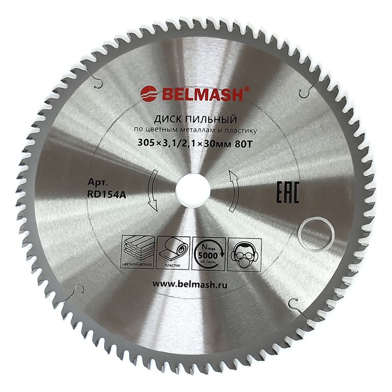 Диск пильный BELMASH 305×3,1/2,1×30; 80T предназначен для резки цветных металлов (алюминий, медь и т.п.) и пластика. Имеет 80 зубьев. Чередующиеся прямые и трапециевидные напайки обеспечивают аккуратный распил. Плоская верхняя грань позволяет свести к минимуму сколы. Угол наклона зубьев (угол атаки) положительный, такая геометрия дает преимущества при резке толстостенного профиля.