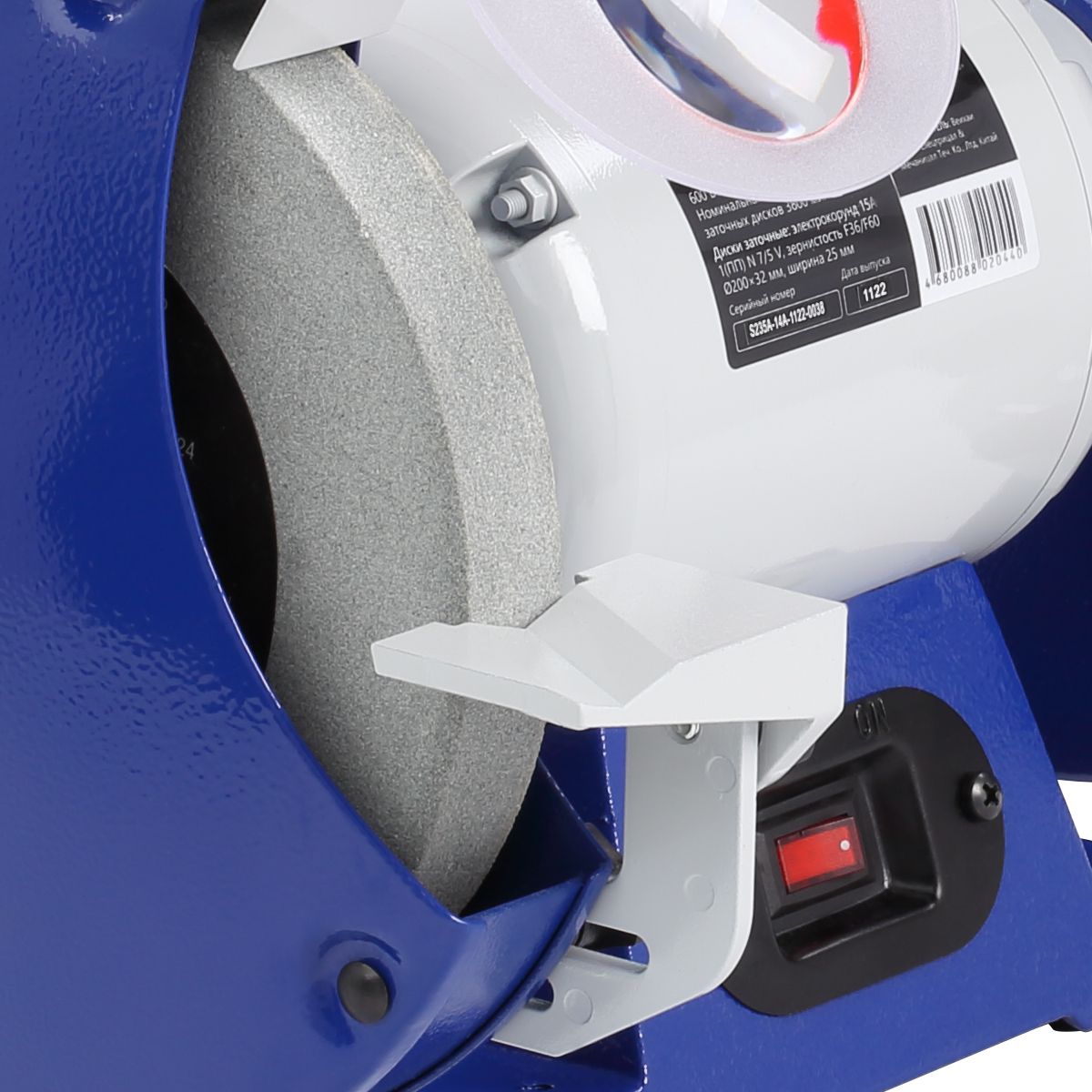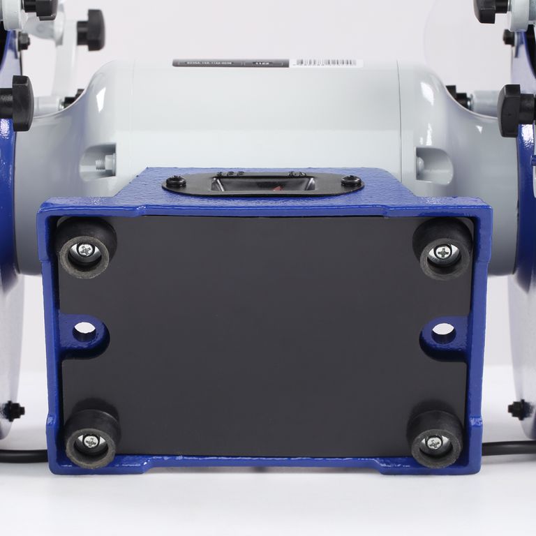 По центру расположен мощный асинхронный двигатель (600 Вт). По обе стороны от двигателя установлены заточные диски диаметром 200 мм и шириной 25 мм с различной зернистостью. Диски изготовлены из нормального электрокорунда (15А). Такой абразив используют для снятия заусенцев, фасок, обдирки на небольших заготовках, восстановления эксплуатационных свойств ручного инструмента, такого как ножи, топоры, секаторы и т. п. Оба диска оснащены рабочими упорами (литой алюминий), защитными кожухами, узлами подсветки, искрозащитными экранами (один из них с линзой).