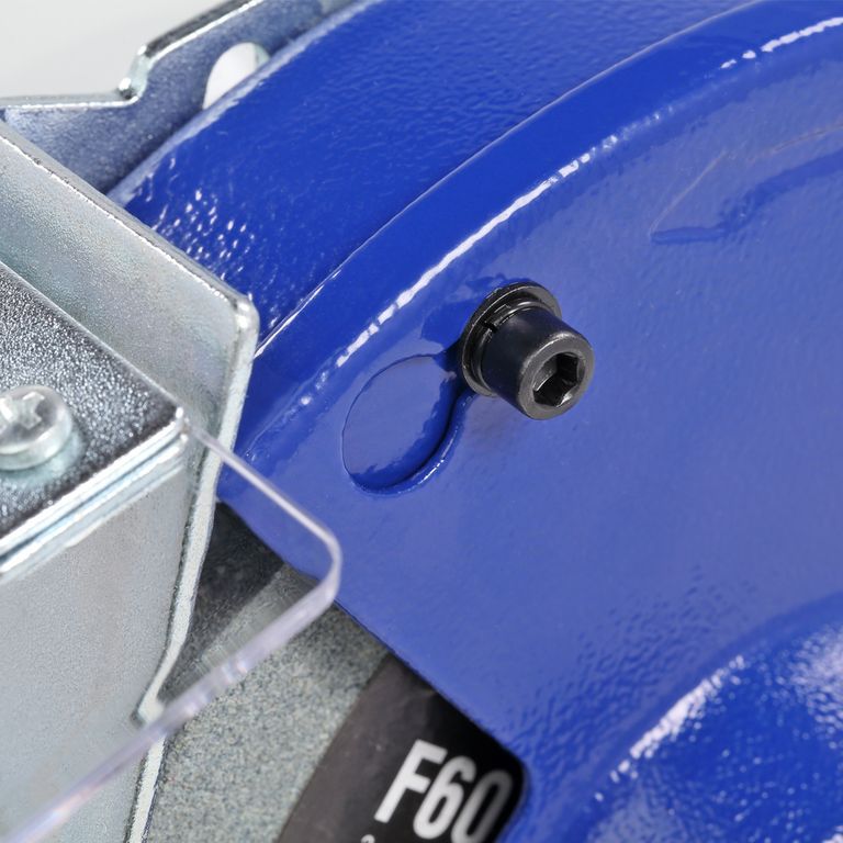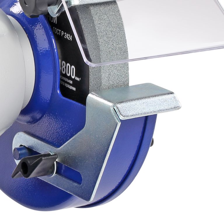 Это модель среднего размера с традиционной компоновкой. По центру расположен мощный асинхронный двигатель - 450 Вт. По обе стороны от двигателя установлены заточные диски диаметром 150 мм и шириной 20 мм с различной зернистостью. Диски изготовлены из нормального электрокорунда (15А). Такой абразив используют для снятия заусенцев, фасок, обдирки на небольших заготовках, восстановления эксплуатационных свойств ручного инструмента, такого как ножи, топоры, секаторы и т. п. Оба диска оснащены рабочими упорами (подручниками), защитными кожухами (листовая сталь), искрозащитными экранами (поликарбонат).
