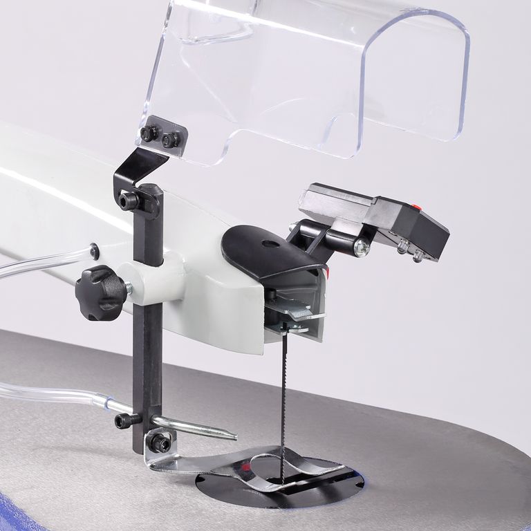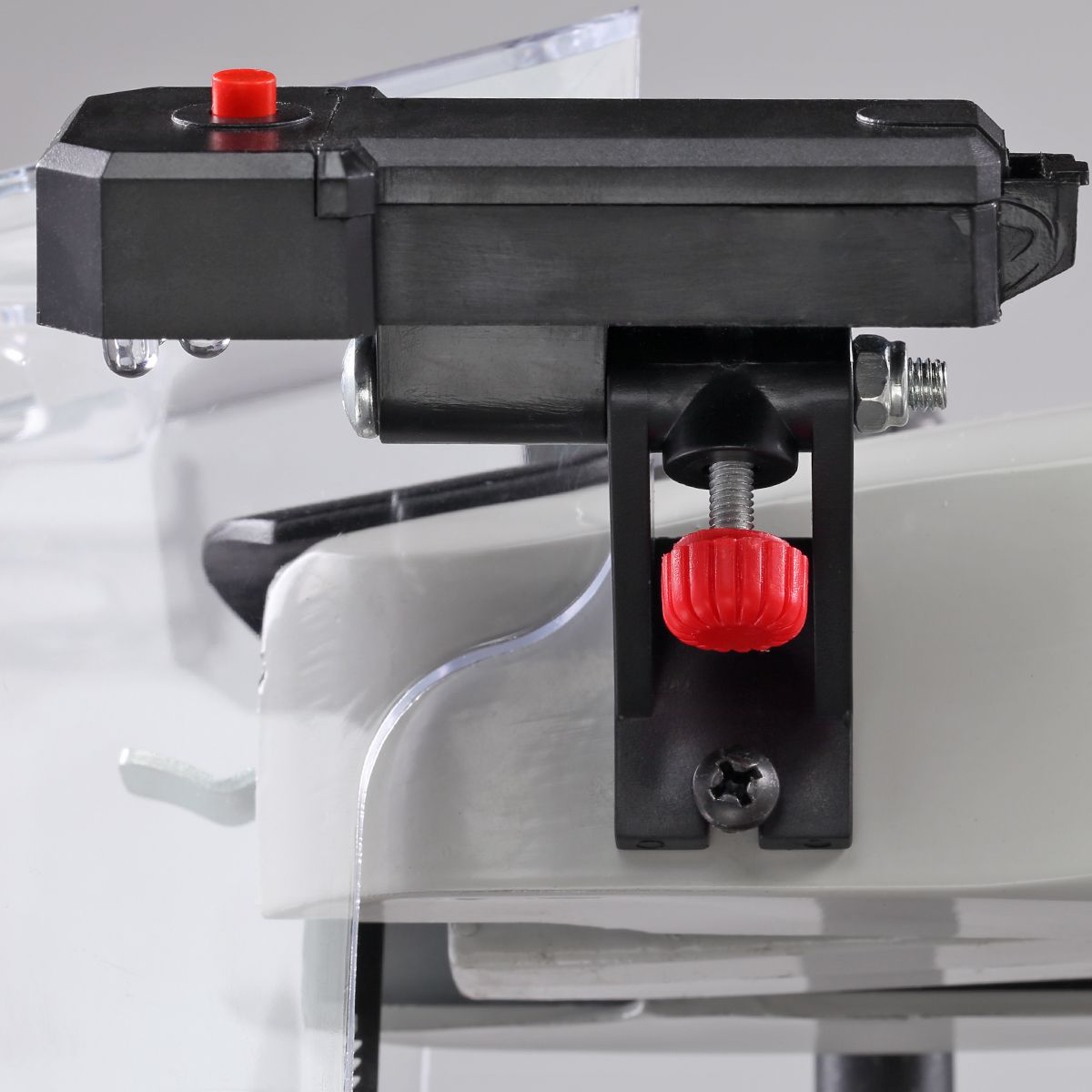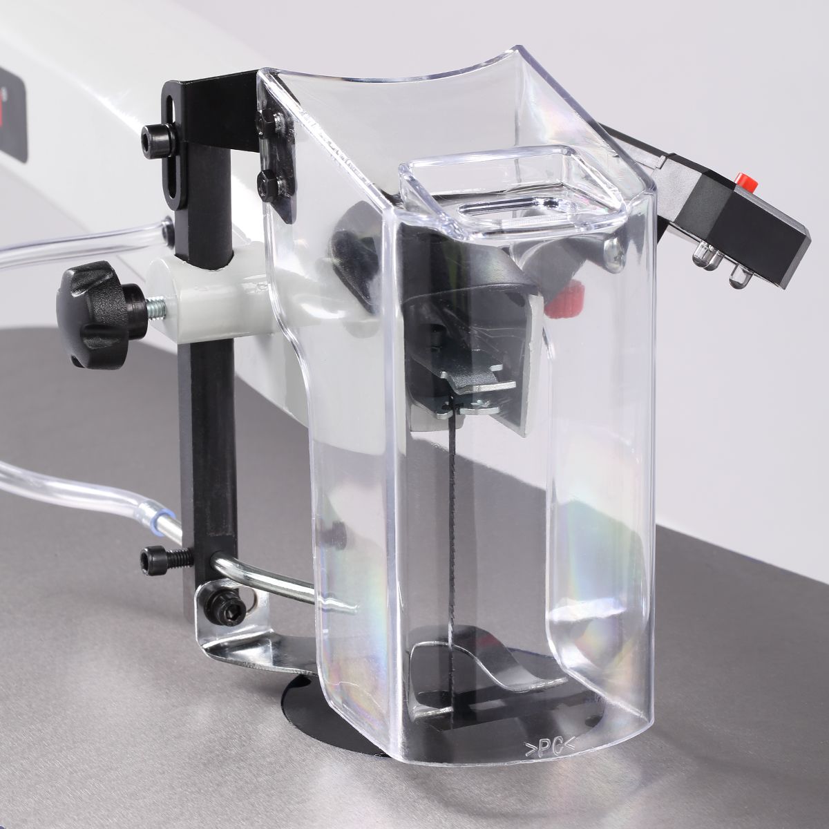 Зона реза закрыта защитным пластиковым экраном. Чистоту рабочего места обеспечивают система сдува пыли с линии реза и патрубок для подключения к системе аспирации.