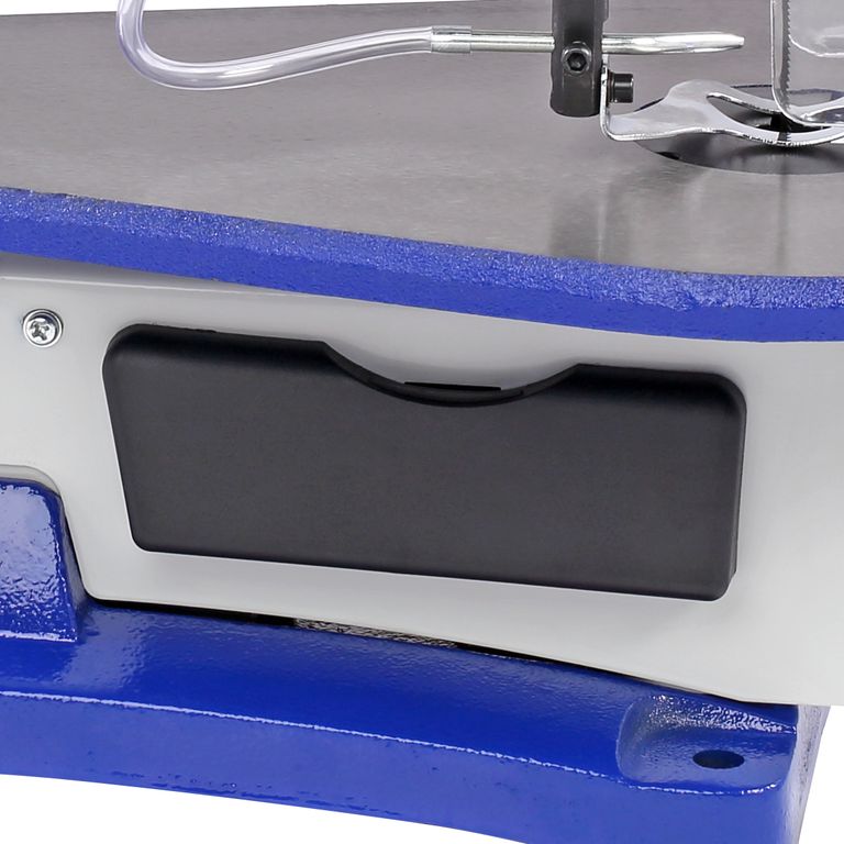 На чугунной станине установлен чугунный рабочий стол (262 x 490 мм), который имеет механизм угла наклона -10° вправо …+45° влево.