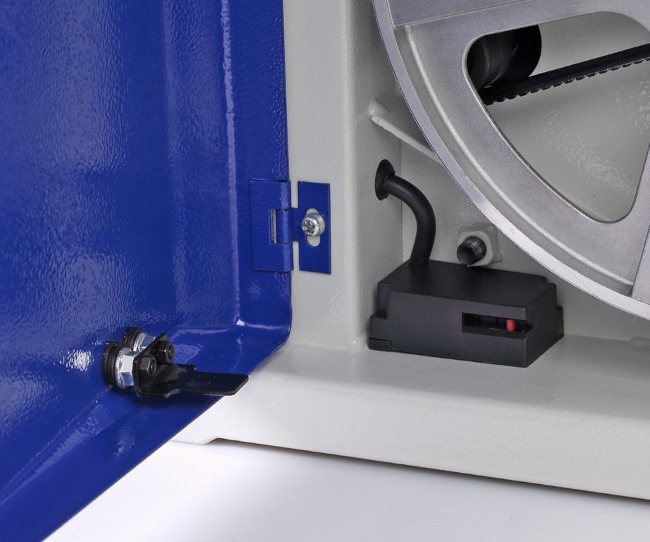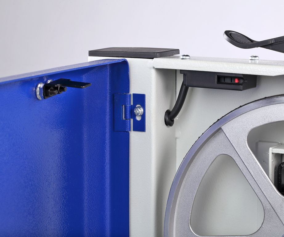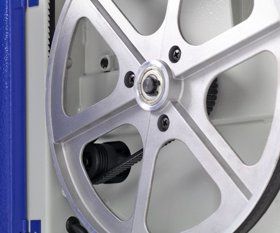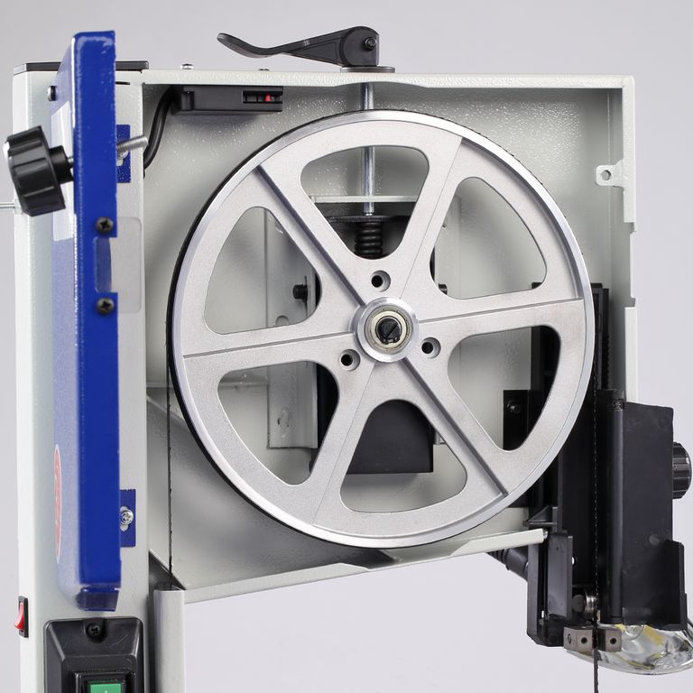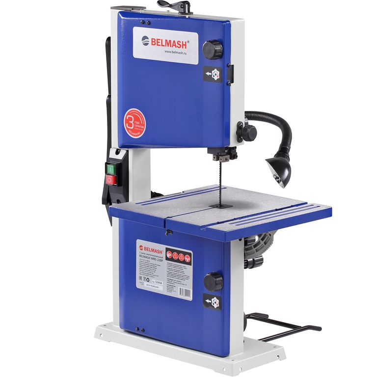 Питание станка осуществляется от однофазной сети переменного тока напряжением 230 В. Электродвигатель асинхронный, мощность - 400 Вт. Вращение от двигателя к шкивам передается с помощью ременной передачи. Скорость пильного полотна - 635 м/мин. Модель компактная, установка настольная.