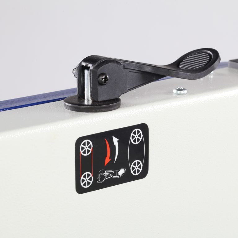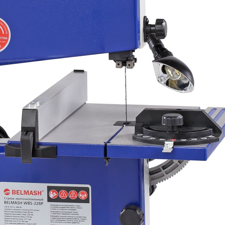 Рабочий стол изготовлен из алюминия (313×306 мм), имеет возможность наклона от 0 до 45 градусов. На переднюю часть стола крепится параллельный упор. В столе есть паз для установки углового упора, обеспечивающий угол от -60 до +60 градусов. Просвет до рамы - 228 мм. Максимальная высота обработки - 89 мм. Учитывайте эти параметры при выборе заготовок.