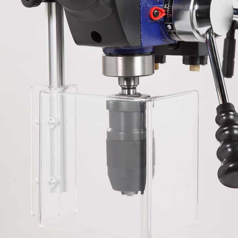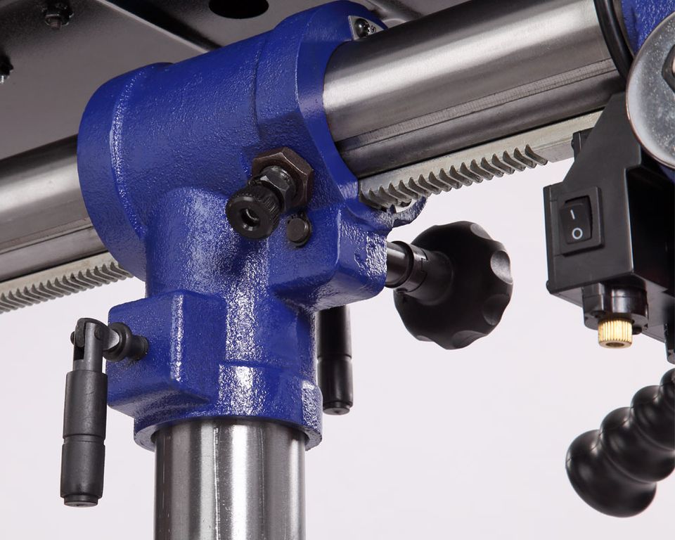 Шкала, расположенная на рукоятке регулировки глубины сверления, показывает ход пиноли шпинделя, с ее помощью можно настраивать нужное значение. Наконечники тройной рукояти удобной формы, что способствует плавной подаче сверла к заготовке.