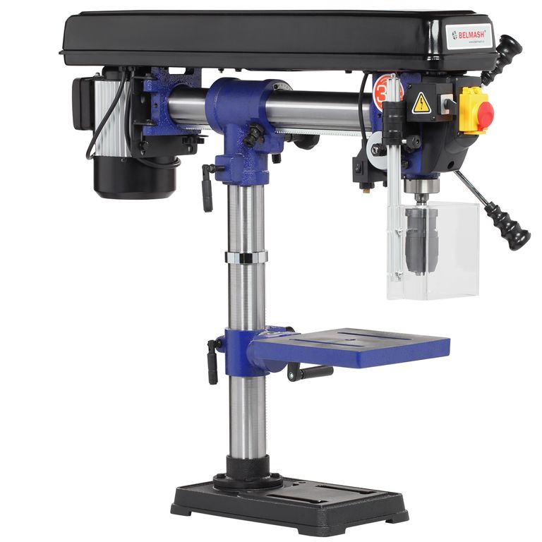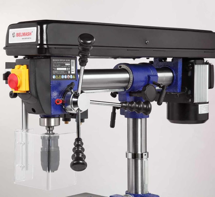 Модель RDP430-16/380 является радиальной, то есть возможны поворот сверлильной головки относительно вертикальной оси (360 град.), наклон относительно горизонтальной оси (45 град. вправо, 90 град. влево) и есть ход по горизонтали. Стол, опора и корпус сверлильной головки выполнены из чугуна. На основании имеется два отверстия для дополнительной фиксации станка.