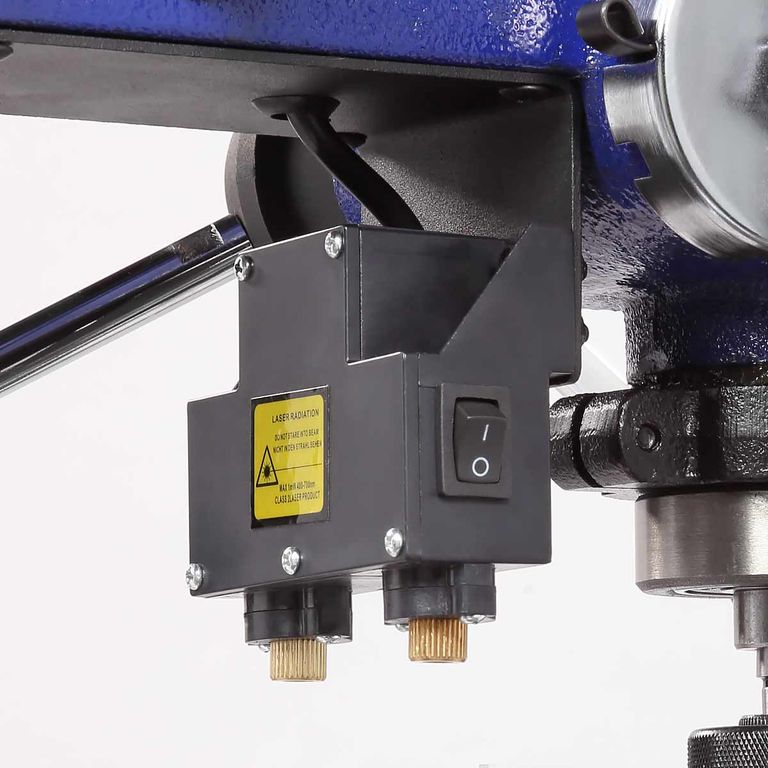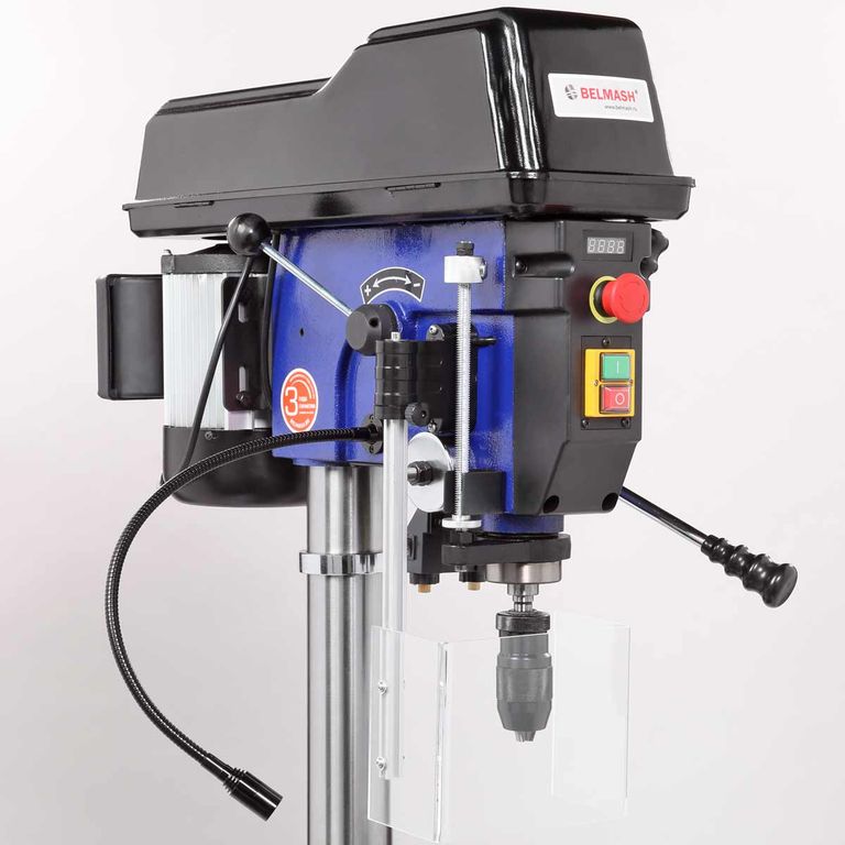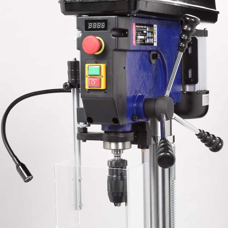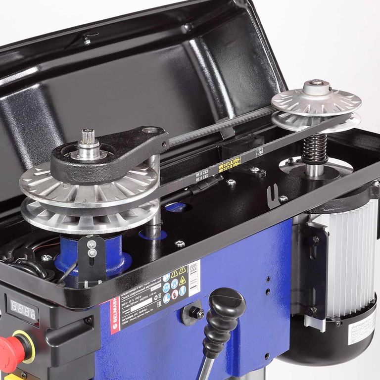 Двигатель асинхронный, мощный, 1100 Вт. Благодаря вариатору станок имеет диапазон скорости вращения шпинделя от 440 до 2100 об./мин., что необходимо при различных операциях и материалах. Рукоятка регулировки выведена на левый торец сверлильной головки.