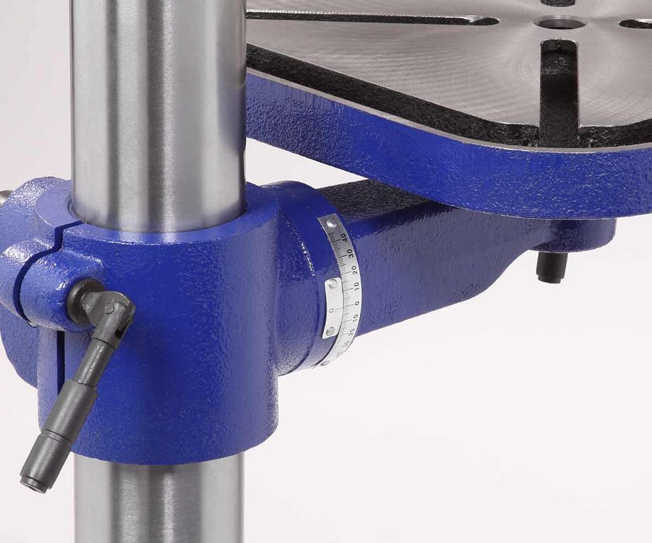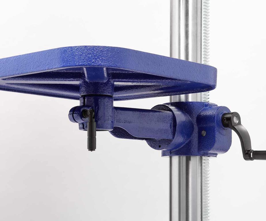 На колонне (ее диаметр 80 мм) имеется зубчатая рейка для плавного поднятия/опускания стола, его положение настраивается с помощью рукоятки.
