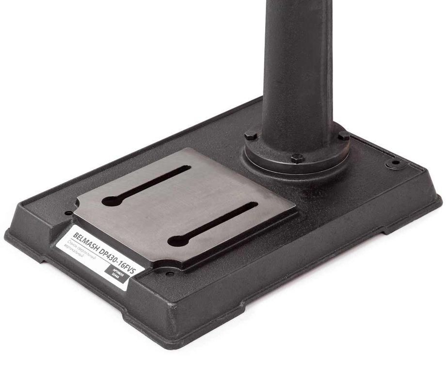 Модель DP430-16FVS одна из самых интересных в линейке по функционалу. Стол, опора и корпус сверлильной головки выполнены из чугуна, что придает станку серьезный вес. Установка напольная. На основании имеется четыре отверстия для дополнительной фиксации станка.