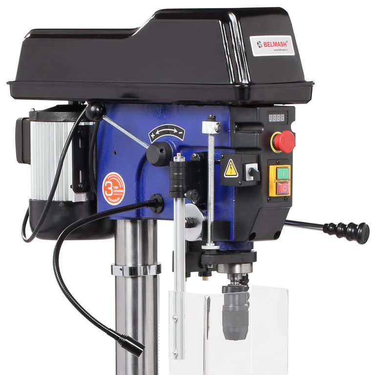 Максимальный ход пиноли шпинделя 150 мм. Возможно ограничение хода пиноли, путем перемещения стопора по планке. Наконечники тройной рукояти удобной формы, что способствует плавной подаче сверла к заготовке.