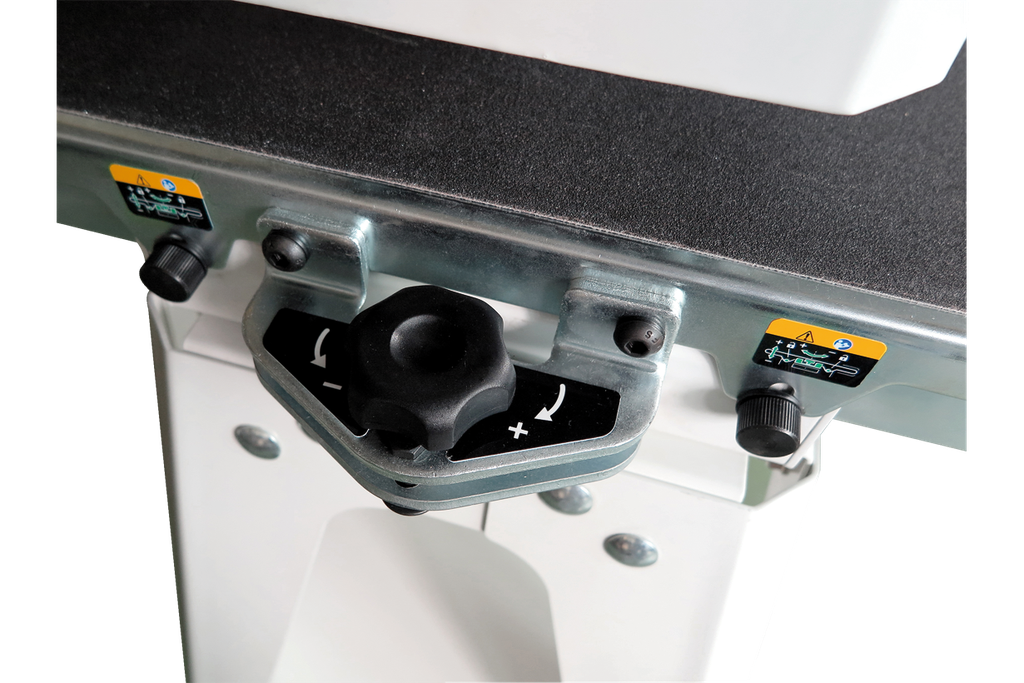 Высота над лентой транспортера регулируется вращением рукоятки, при этом можно контролировать как абсолютное значение по миллиметровой шкале на корпусе, так и относительное перемещение по лимбу на рукоятке. Регулировка параллельности вала и основания производится без использования вспомогательного инструмента: два фиксатора и винтовой упор оборудованы барашковыми рукоятками.