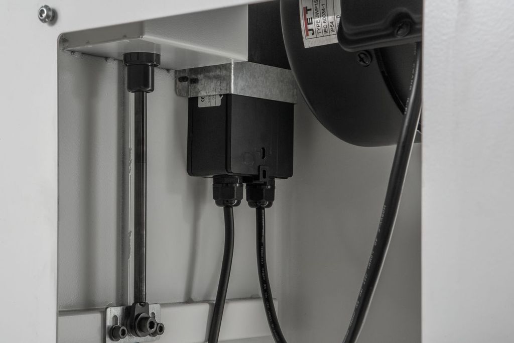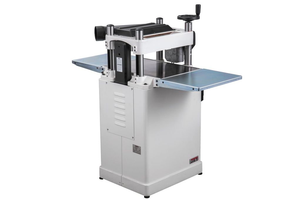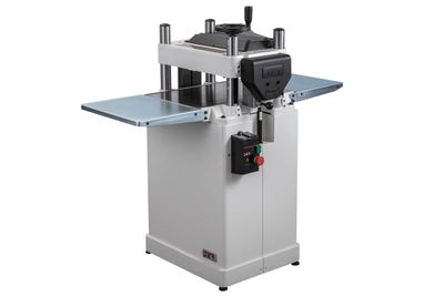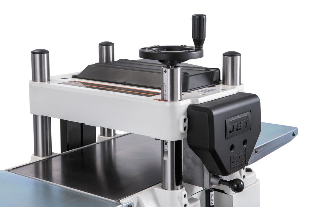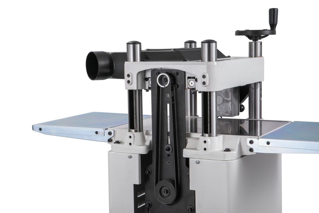 JWP-15B — профессиональный рейсмусовый станок с откидными столами, оптимальный для использования в небольших столярных мастерских. Это полностью новая современная модель, сочетающая высокие рабочие характеристики и удобство эксплуатации. К примеру, для облегчения подъема строгальной части при регулировке установлено два газовых упора, компенсирующих вес подвижной части механизма (к тому же сам узел более легкий из алюминиевой, а не чугунной отливки). Лифт производится вращением штурвала, установленного в горизонтальной плоскости непосредственно на ходовом винте одной из четырех колонн. Один оборот рукоятки приводит к перемещению на 4 мм.