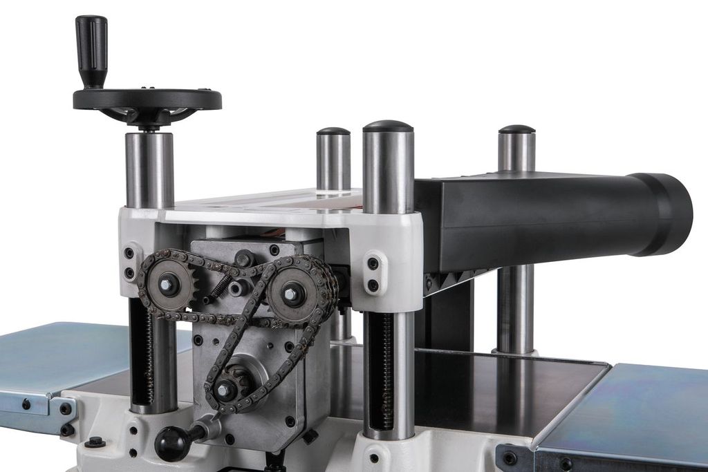 Автоматическая подача заготовки производится двумя валами: передним стальным рифленым и задним обрезиненным гладким. Две скорости переключаются механически при помощи выдвижной рукоятки. Для защиты от выброса заготовки использована когтевая защита. Привод строгального вала поликлиновым ремнем от мотора, расположенного в нижней части корпуса. За счет такой компоновки доступ к ножам максимально упрощен: для прочистки стружки, удаления смолы или замены лезвий достаточно снять кожух пылеудаления. В качестве опции вал можно заменить на сегментированный helical с твердосплавными четырехгранными ножами, установленными в несколько рядов по спирали. Это позволит повысить качество строгания и снизить затраты времени на обслуживание станка за счет большей износостойкости лезвий.