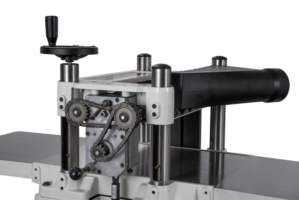 Модель сочетает высокие рабочие характеристики и удобство эксплуатации. К примеру, для облегчения подъема строгальной части при регулировке установлено два газовых упора, компенсирующих вес подвижной части механизма. Лифт производится вращением штурвала, установленного в горизонтальной плоскости непосредственно на ходовом винте одной из четырех колонн. Один оборот рукоятки приводит к перемещению на 4 мм.